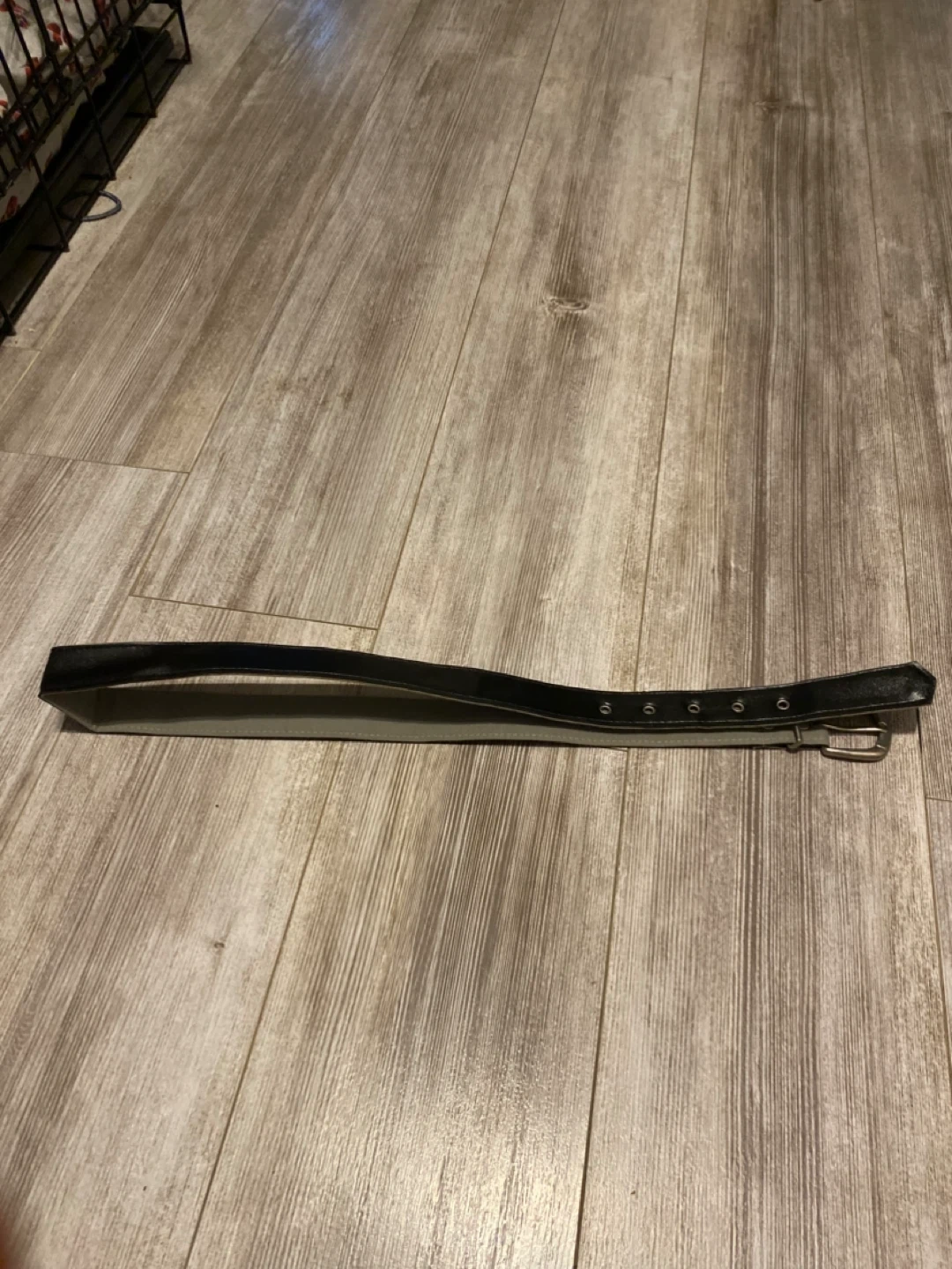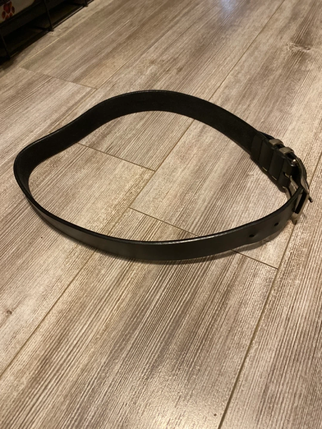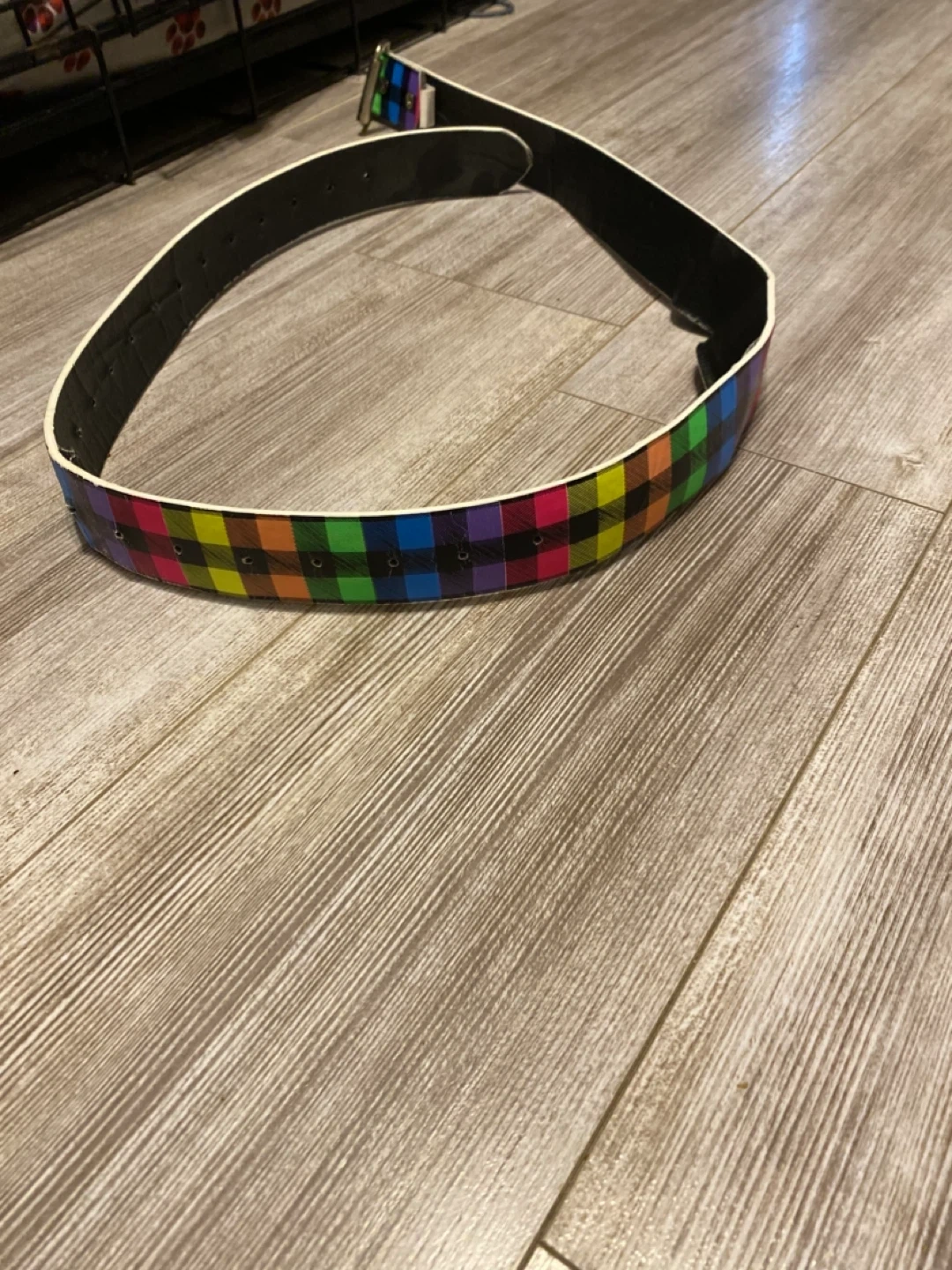 Includes one black studded belt with a silver buckle. Also includes two fabric belts, one with a star pattern and one with a plaid design. All belts are in good condition.