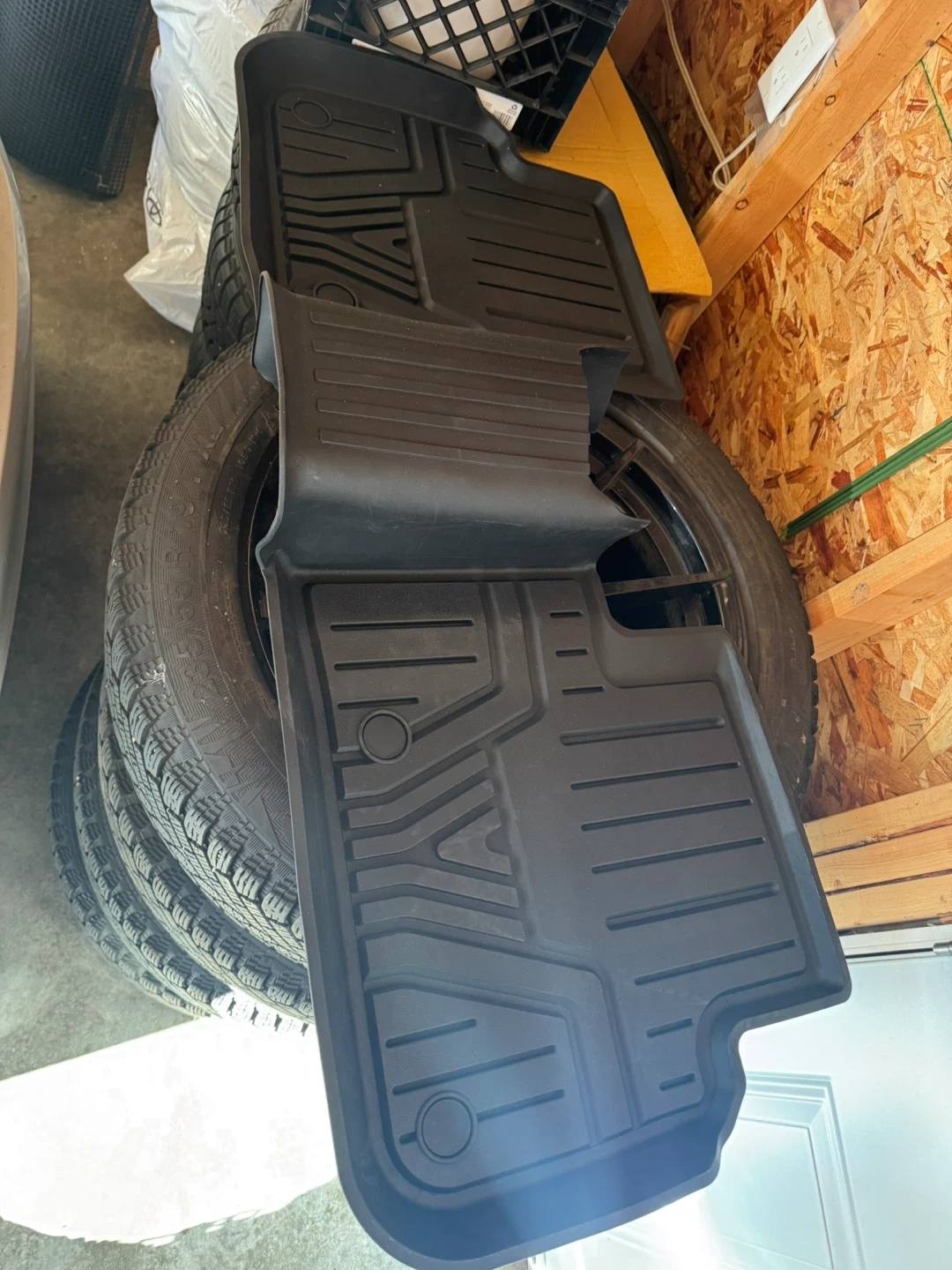 These are LASFIT all-weather floor mats. They're made of durable rubber material to protect your vehicle's interior. They feature deep channels to trap mud and spills.