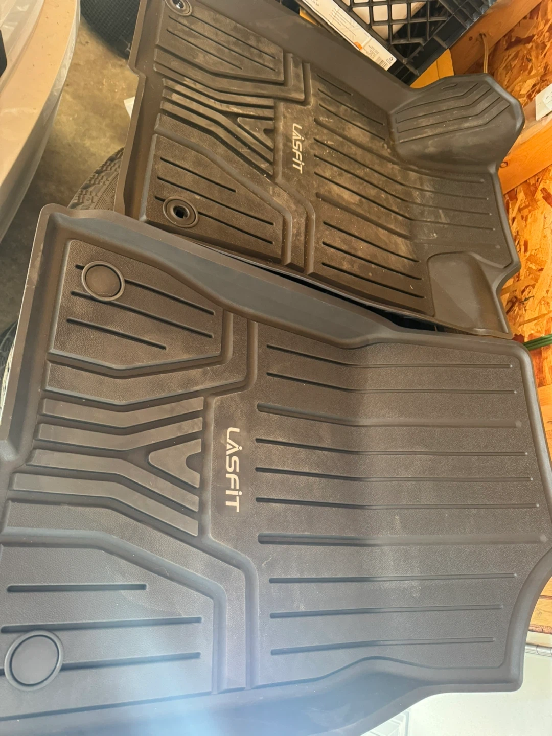 These are LASFIT all-weather floor mats. They're made of durable rubber material to protect your vehicle's interior. They feature deep channels to trap mud and spills.