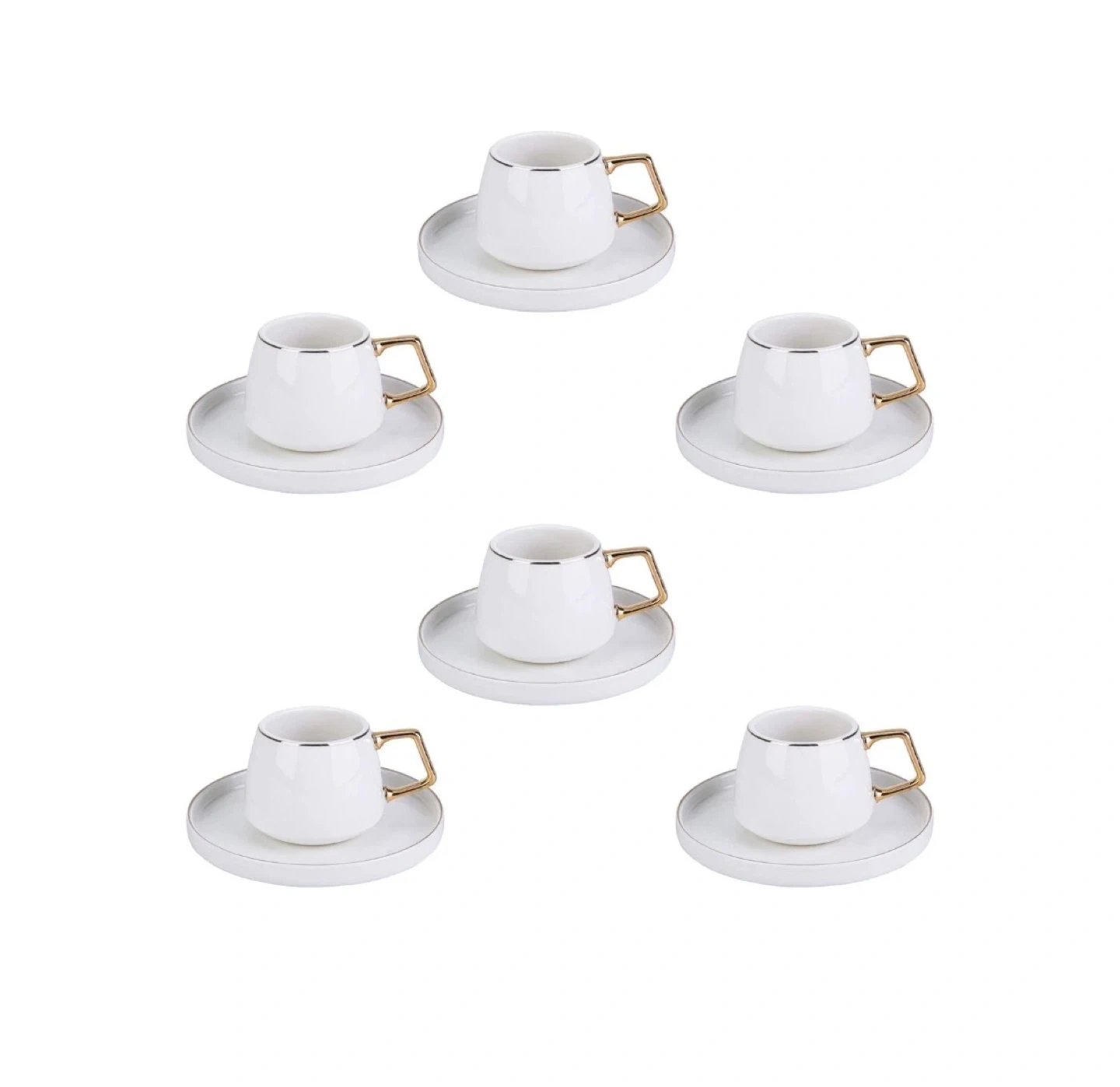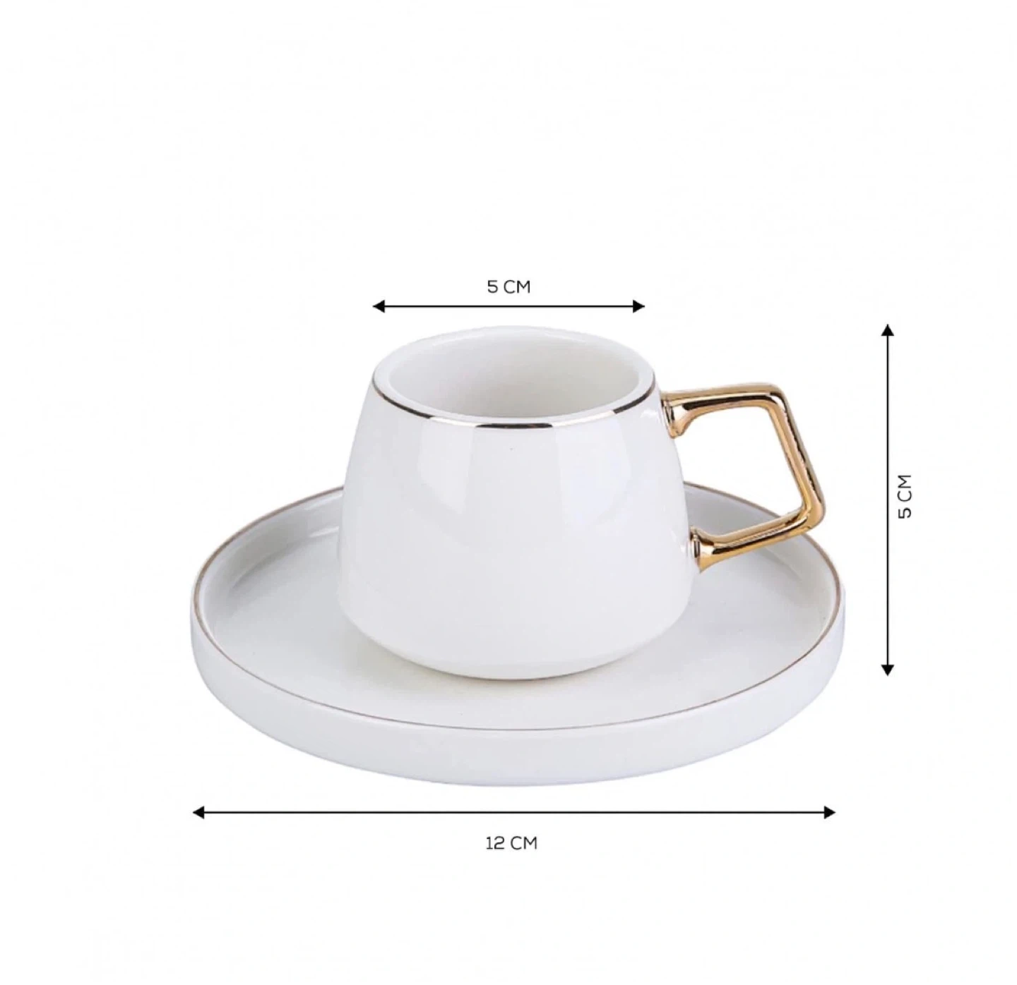 Set of 6 white porcelain coffee cups with gold handles and matching saucers. Each cup holds 100ml. Dishwasher safe for easy cleaning!