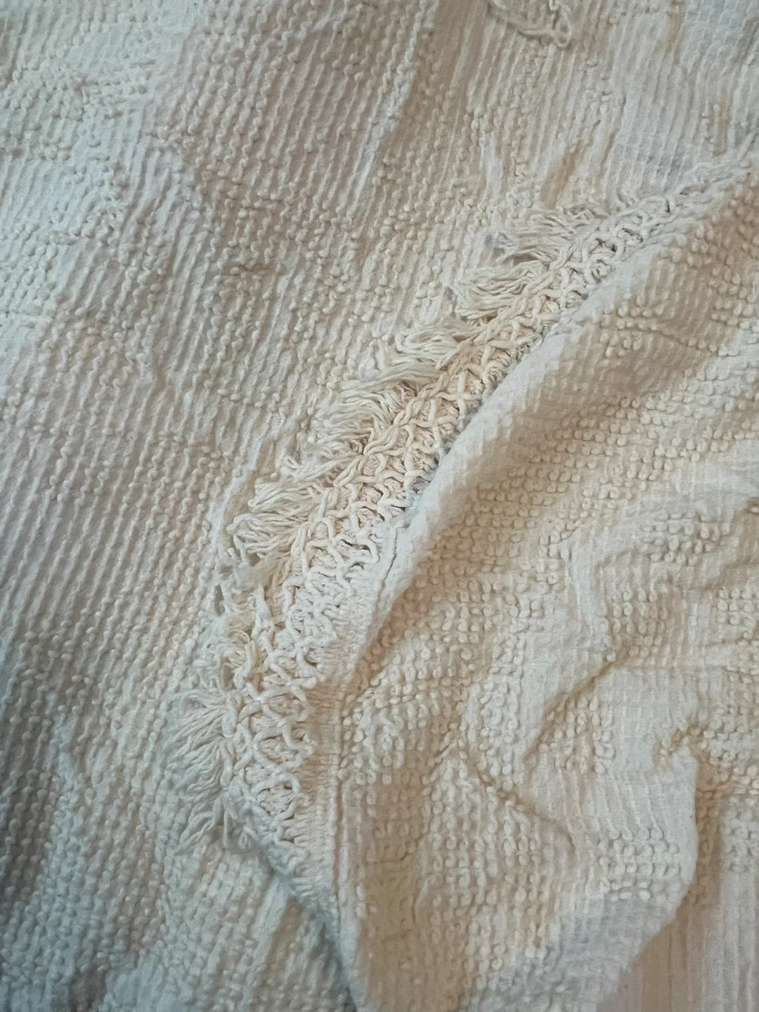 Cozy he like bedspread . Features a soft cotton blend with fringe detailing. Perfect for adding a touch of warmth and style to any room. Double size - used - has a snag