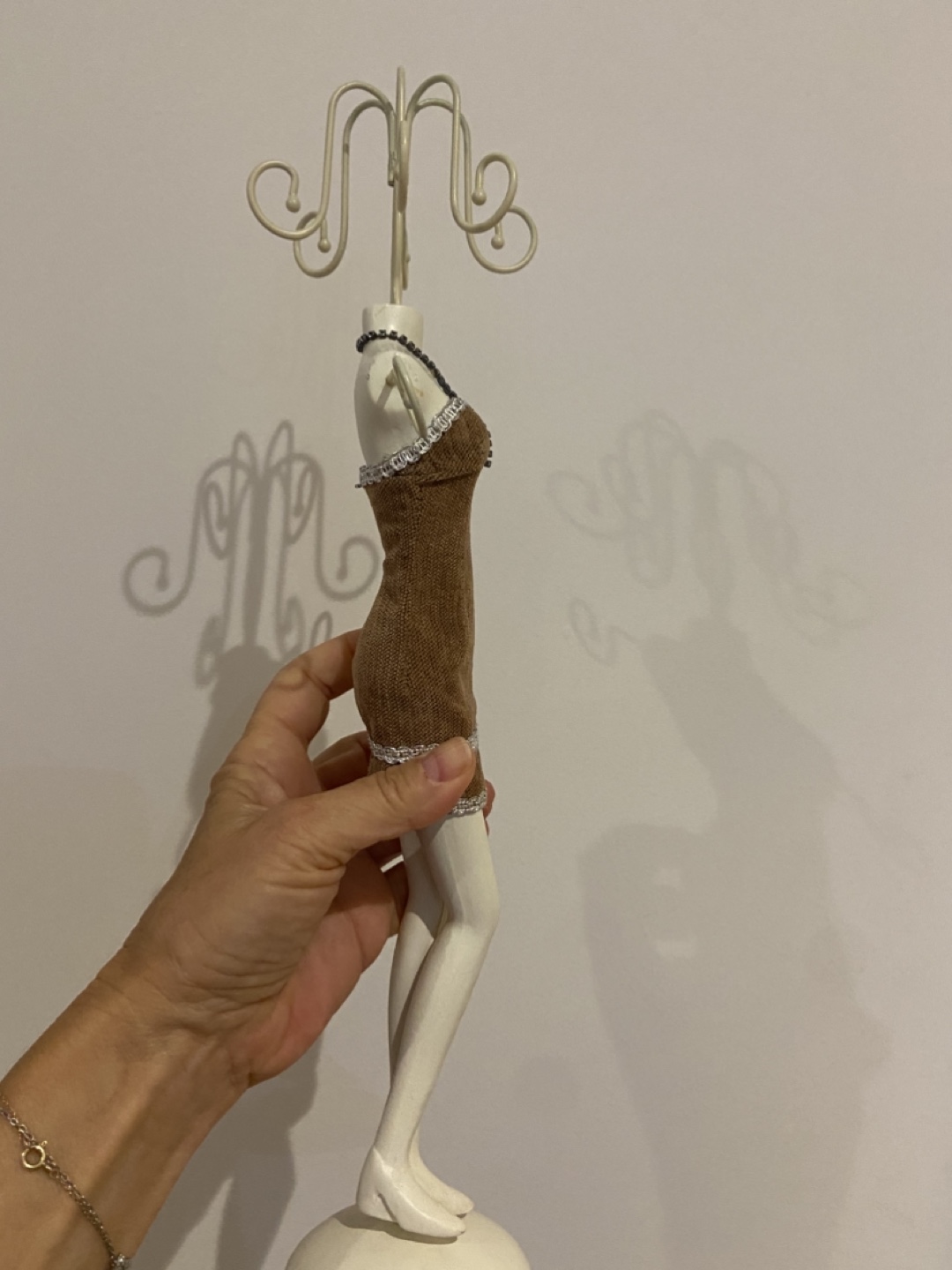 This is a cute jewelry display stand shaped like a dress form! It's perfect for showcasing necklaces and other small accessories. It's in great condition and adds a touch of elegance to any space.