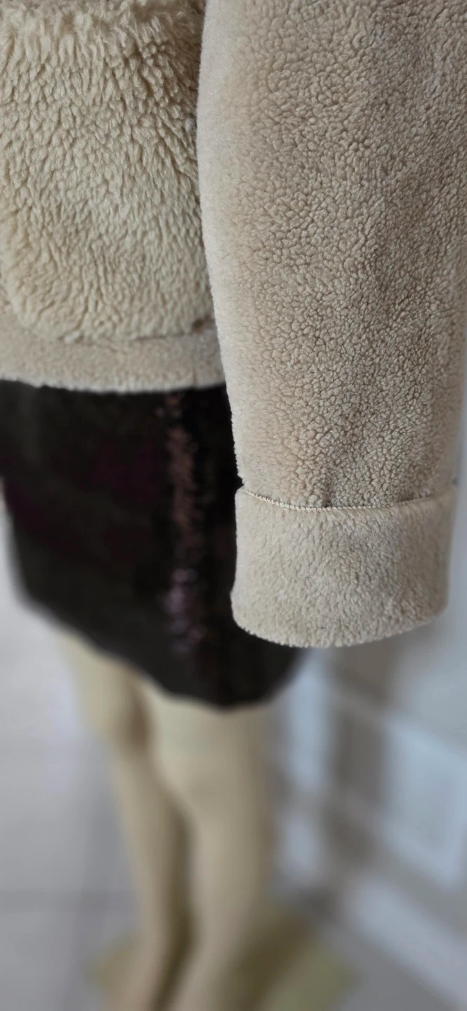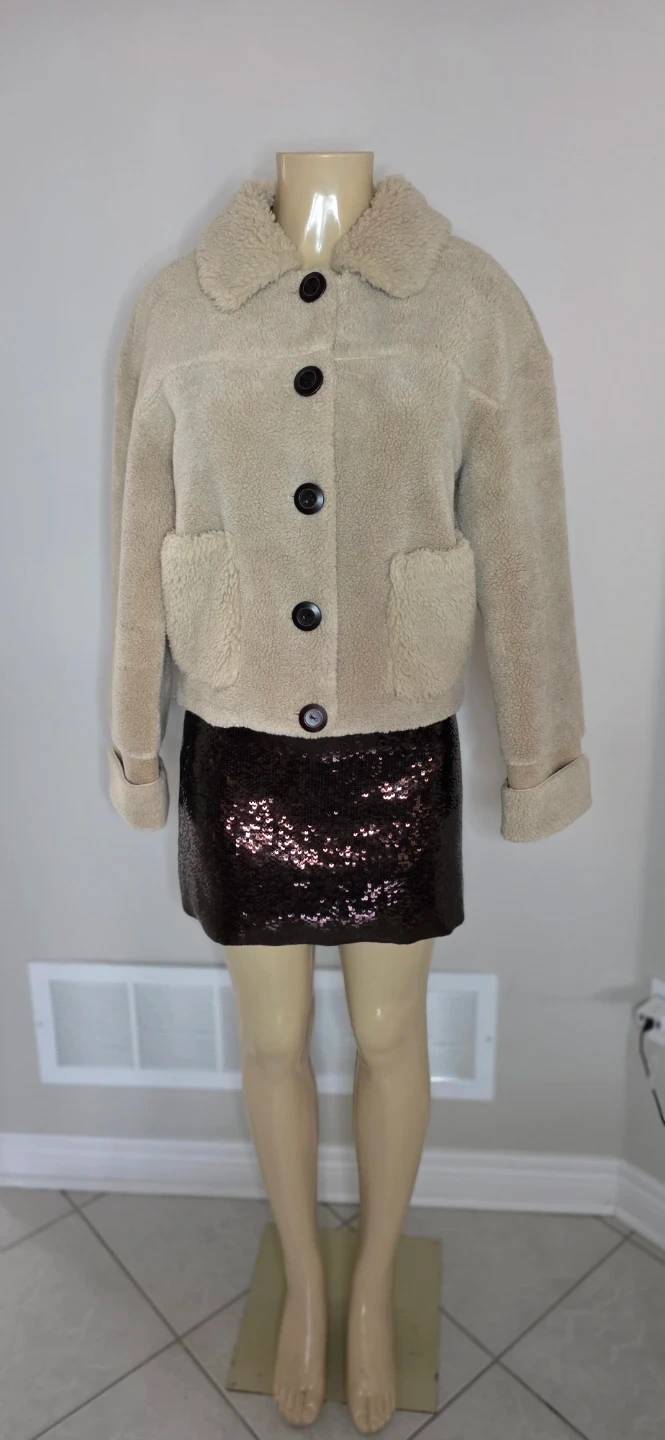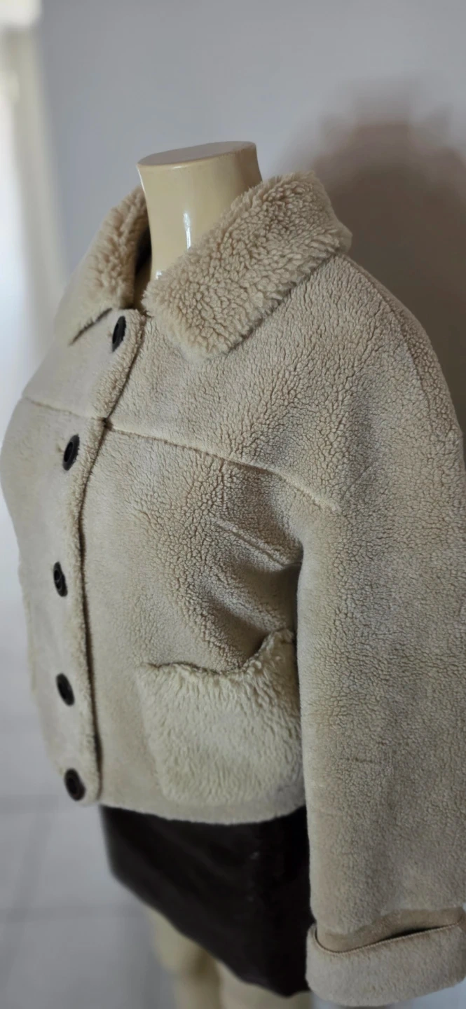 Cozy up in this stylish faux shearling jacket! It's a lovely beige colour and features a button-up front and handy pockets. Perfect for adding a touch of warmth and texture to your outfit.