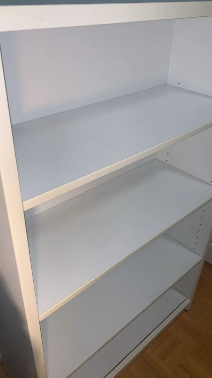 This is a white bookshelf with four shelves. It's made of particleboard and laminate.