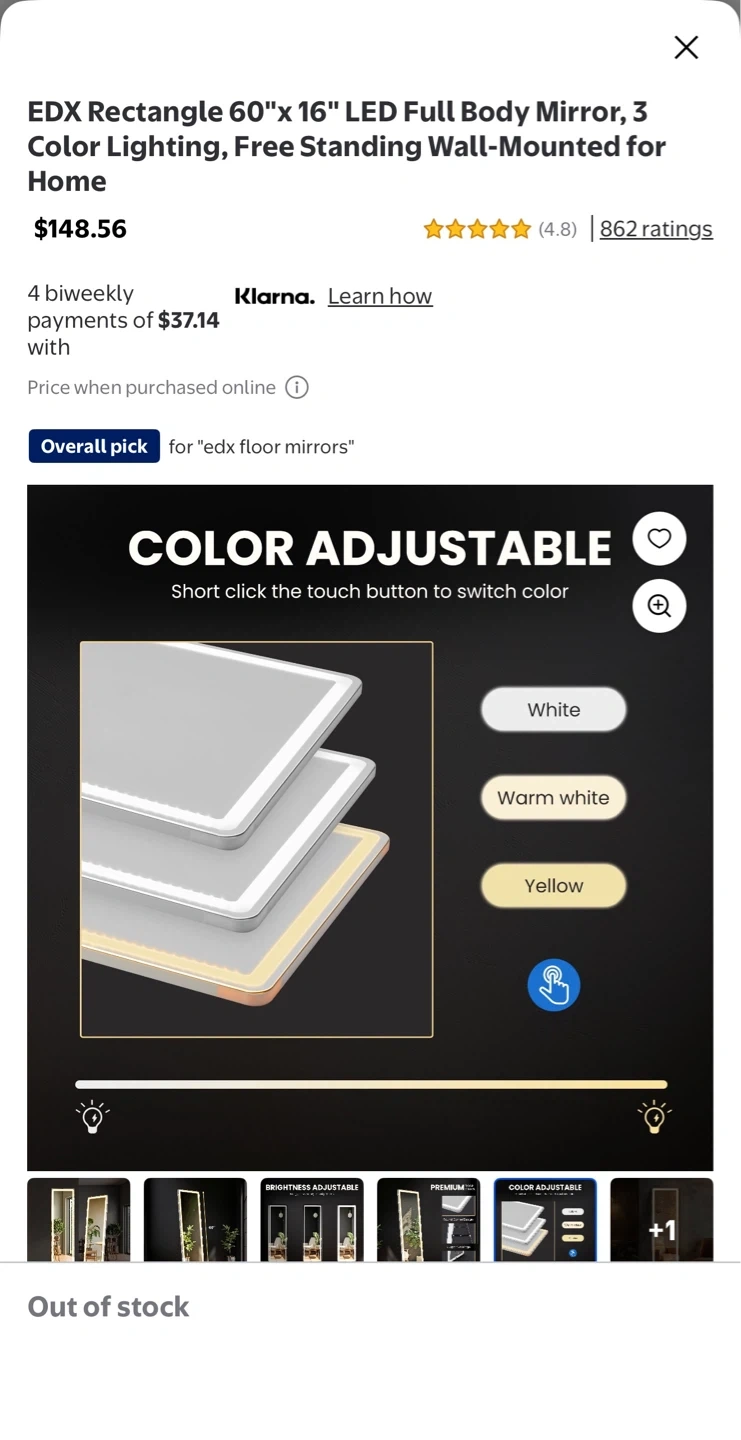 This full body mirror features a 60"x 16" rectangular design with LED lighting. The brightness is adjustable, and you can switch between white, warm white, and yellow light colours. It's designed for free standing or wall mounting. Perfect for checking your outfit from head to toe!