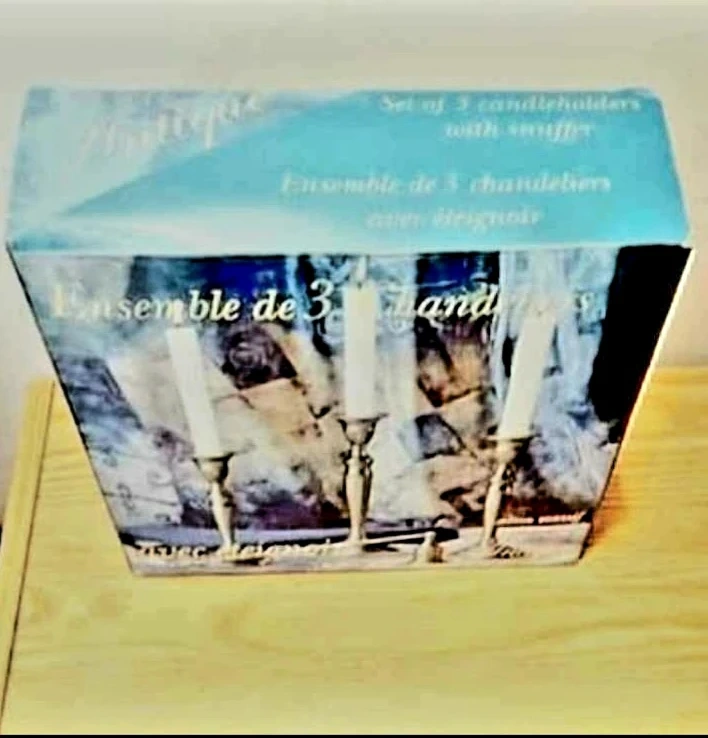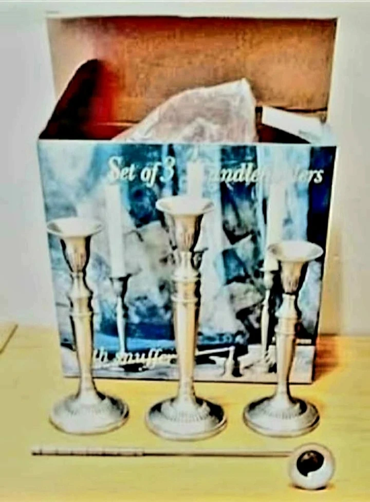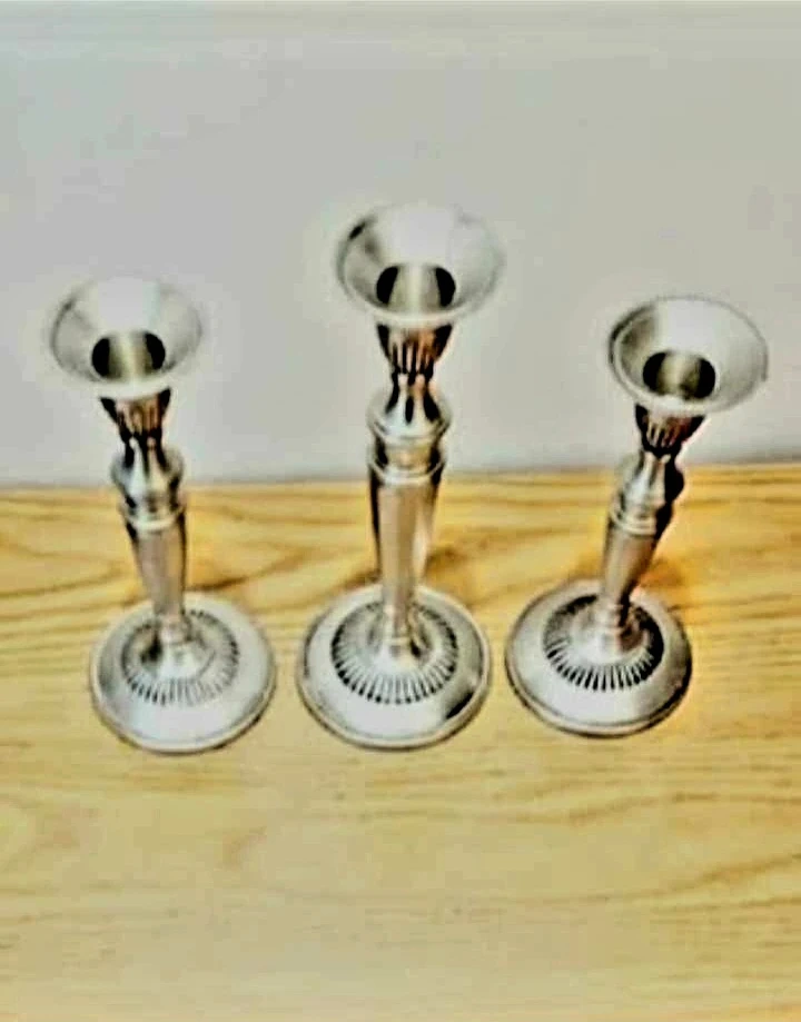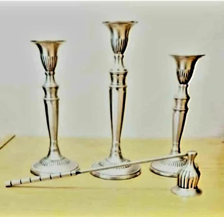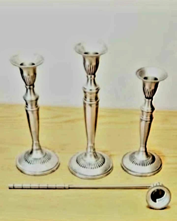 Add a touch of classic elegance to your home with this Solid Brass , Pewter Finished set of three vintage candlesticks, complete with a snuffer.