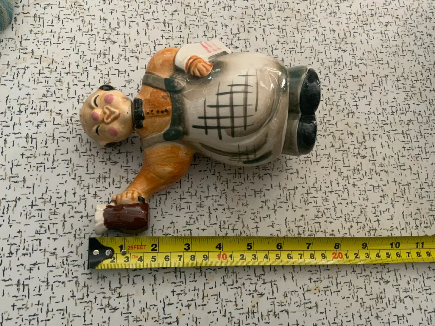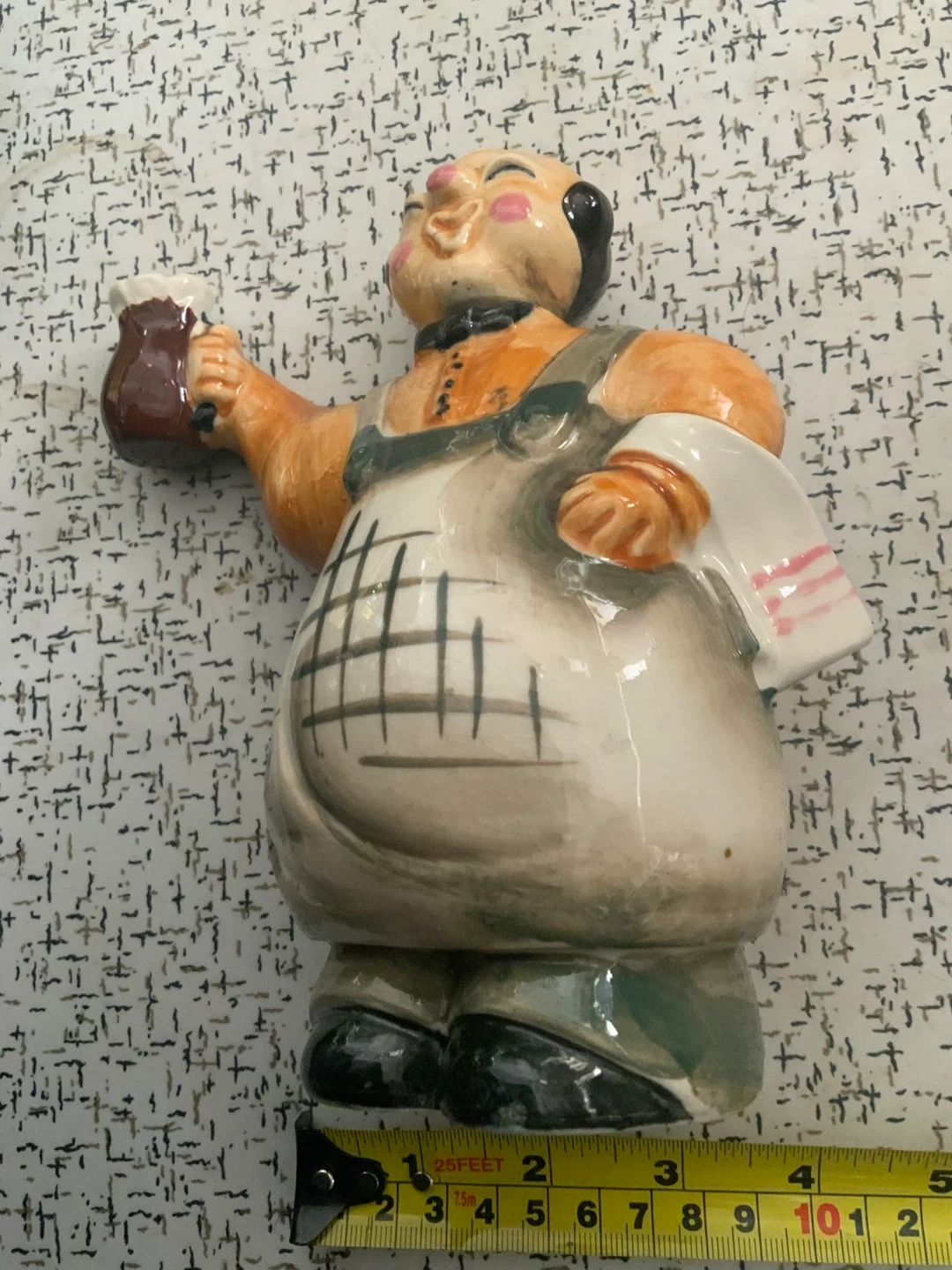 This charming ceramic figurine depicts a cheerful man holding a beer mug and a towel. It's a unique piece that'll add character to your decor. The figurine appears to be made of glazed ceramic.