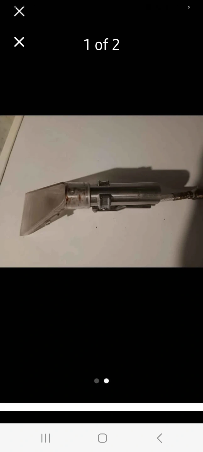 This is a chrome upholstery cleaning tool attachment for a carpet cleaner or extraction machine. It has a clear plastic nozzle at the front and a metal spray nozzle. It includes a hose connection.