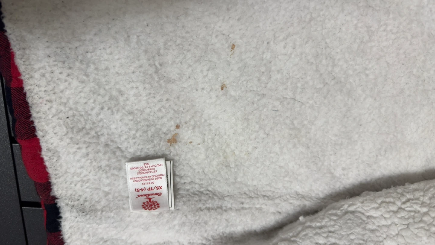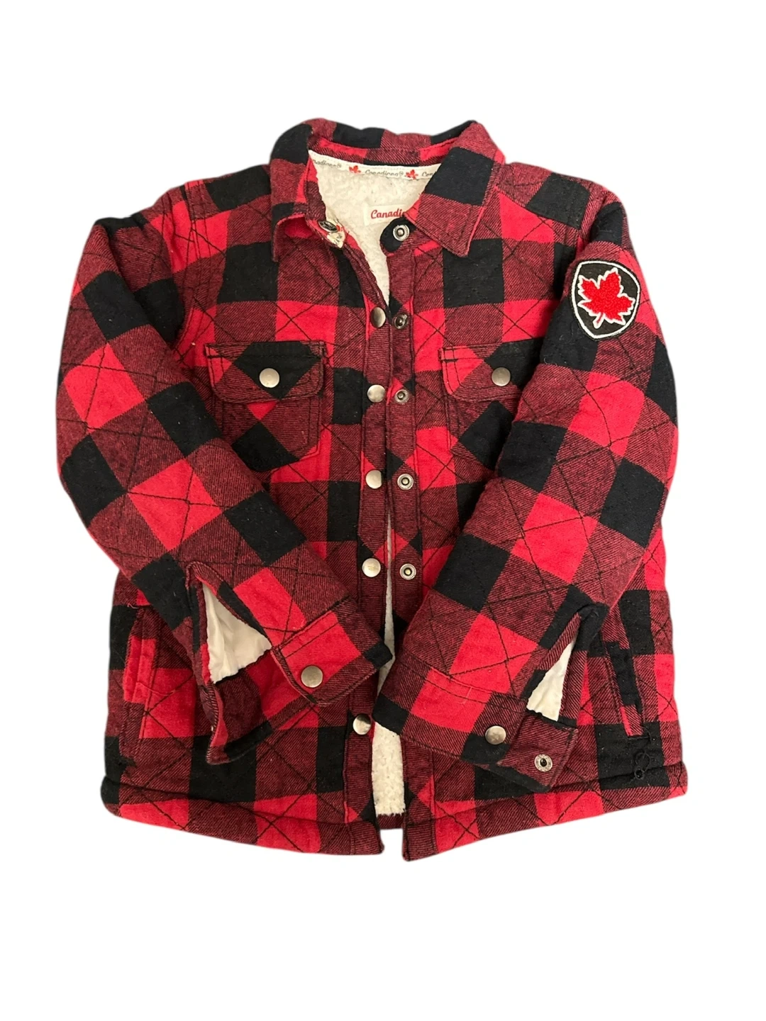 This is a kids red and black buffalo plaid jacket with a cozy sherpa lining. It features snap button closure and chest pockets. Size XS/TP (4-5).