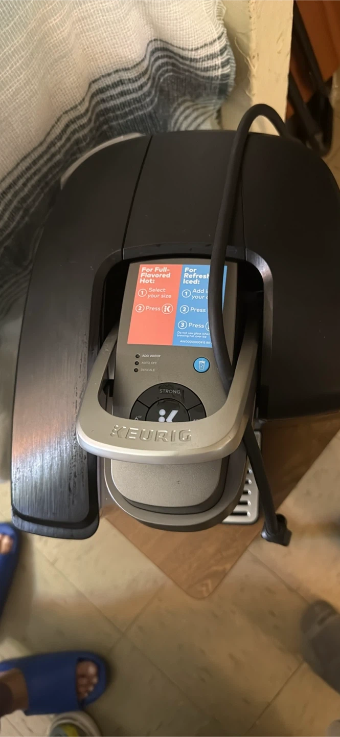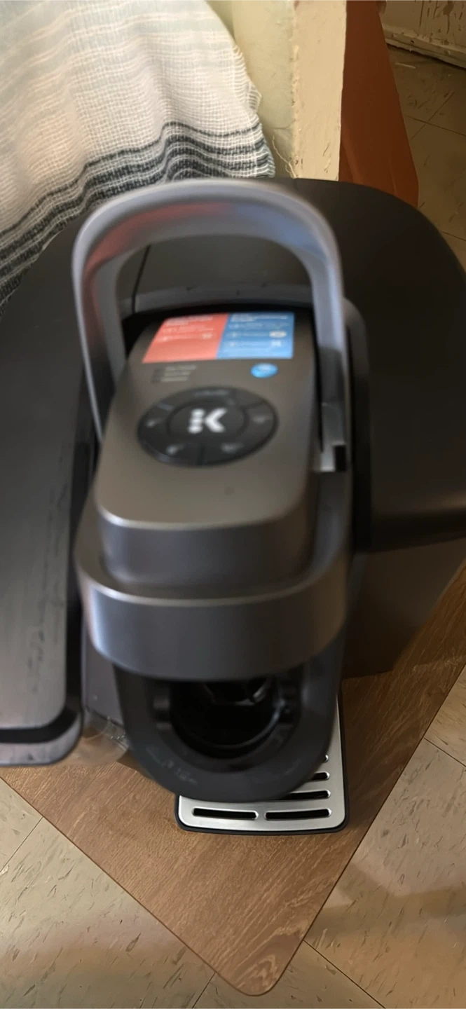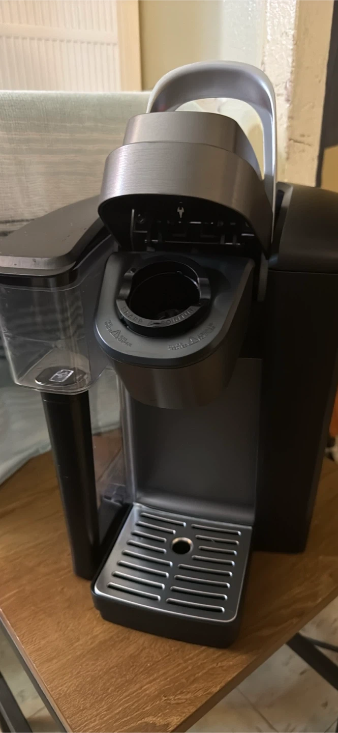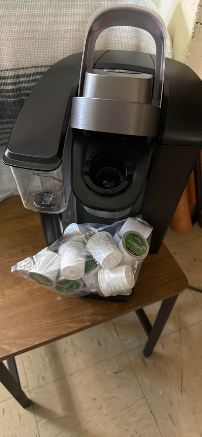 This is a Keurig coffee maker. It's a black and gray model. Includes a bag of K-cups. Makes hot or iced beverages!