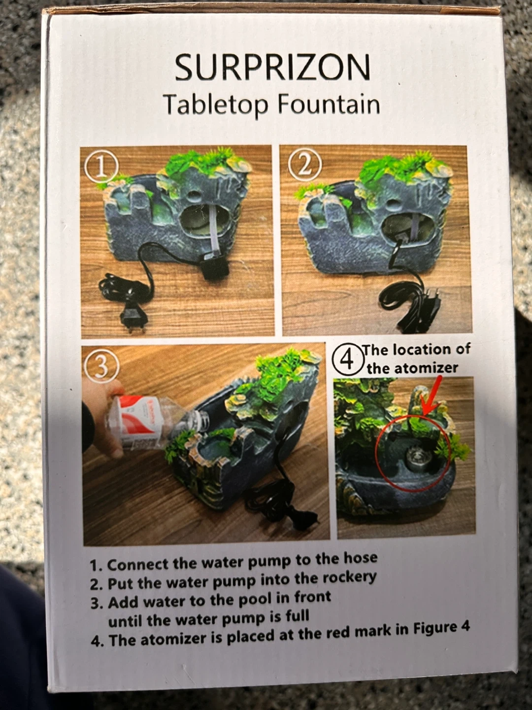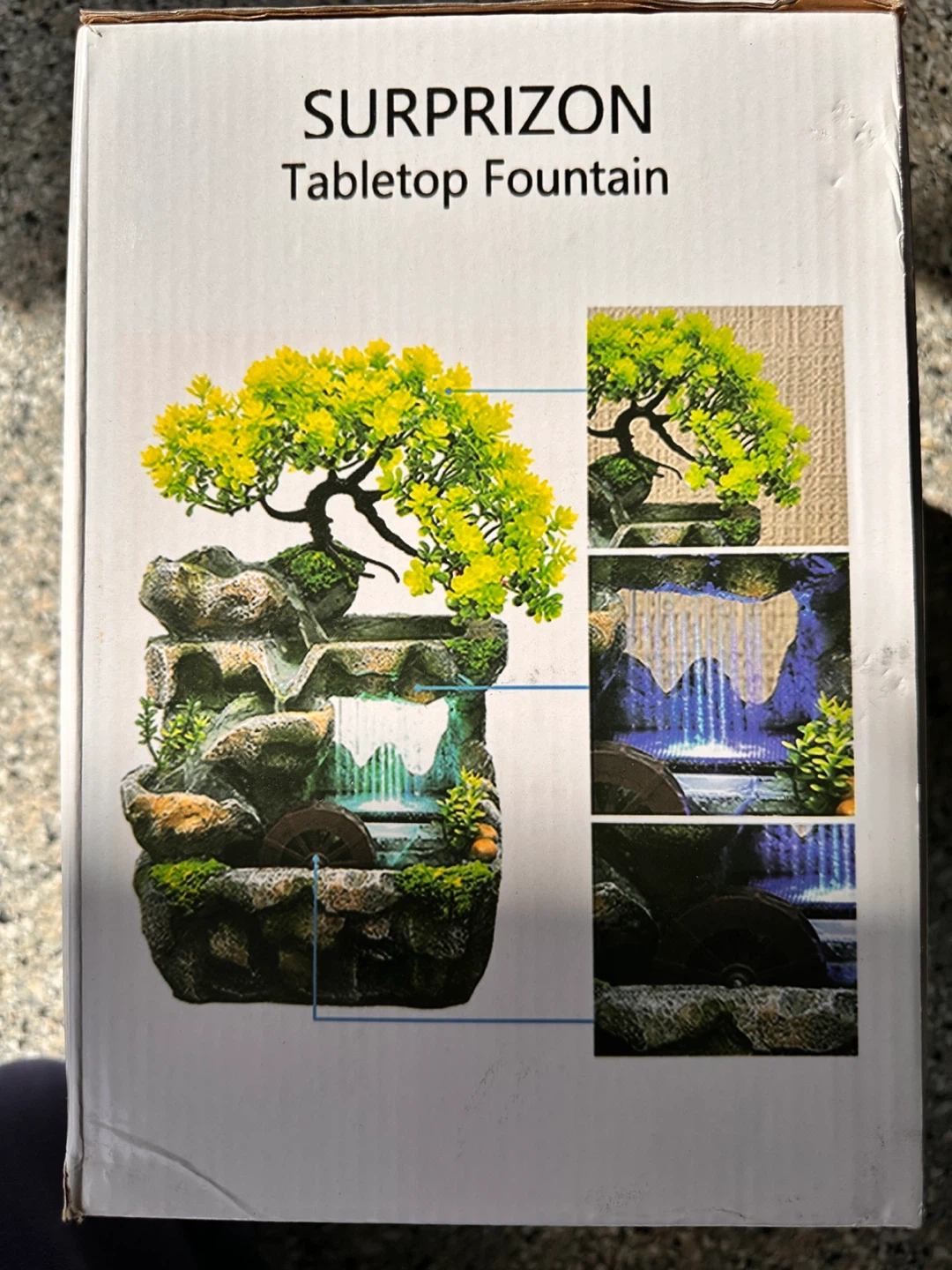 This is a SURPRIZON Tabletop Fountain with a decorative tree and rockery. It includes a water pump and an atomizer for mist effects. Add water and plug it in to enjoy a relaxing ambiance!