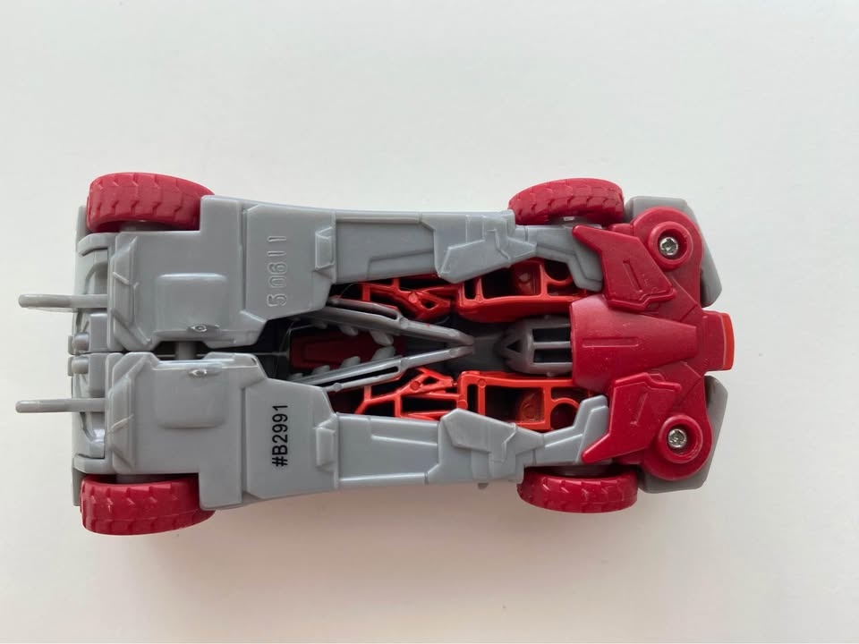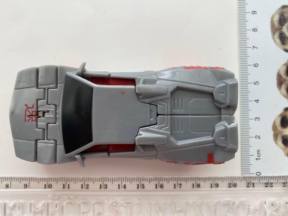 This is a small toy that converts from a robot to a vehicle. It features a drill and is approximately 5 cm tall.
