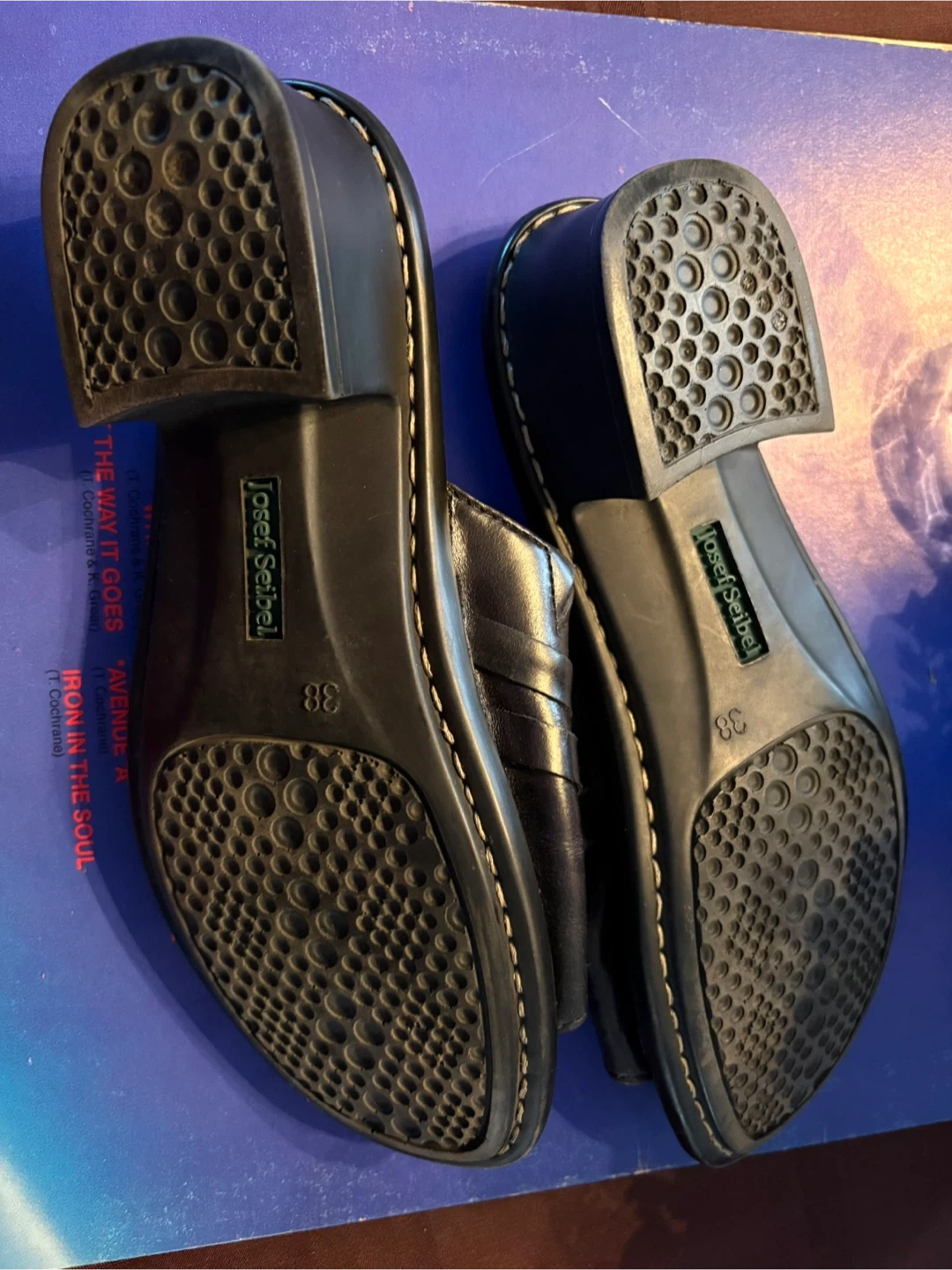 Josef Seibel slip-on sandals in black. Leather upper and lining with a European comfort sole. Marked size 38. (Size 7)