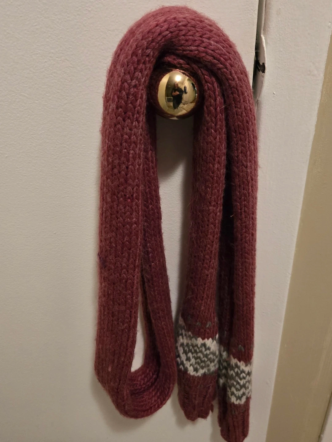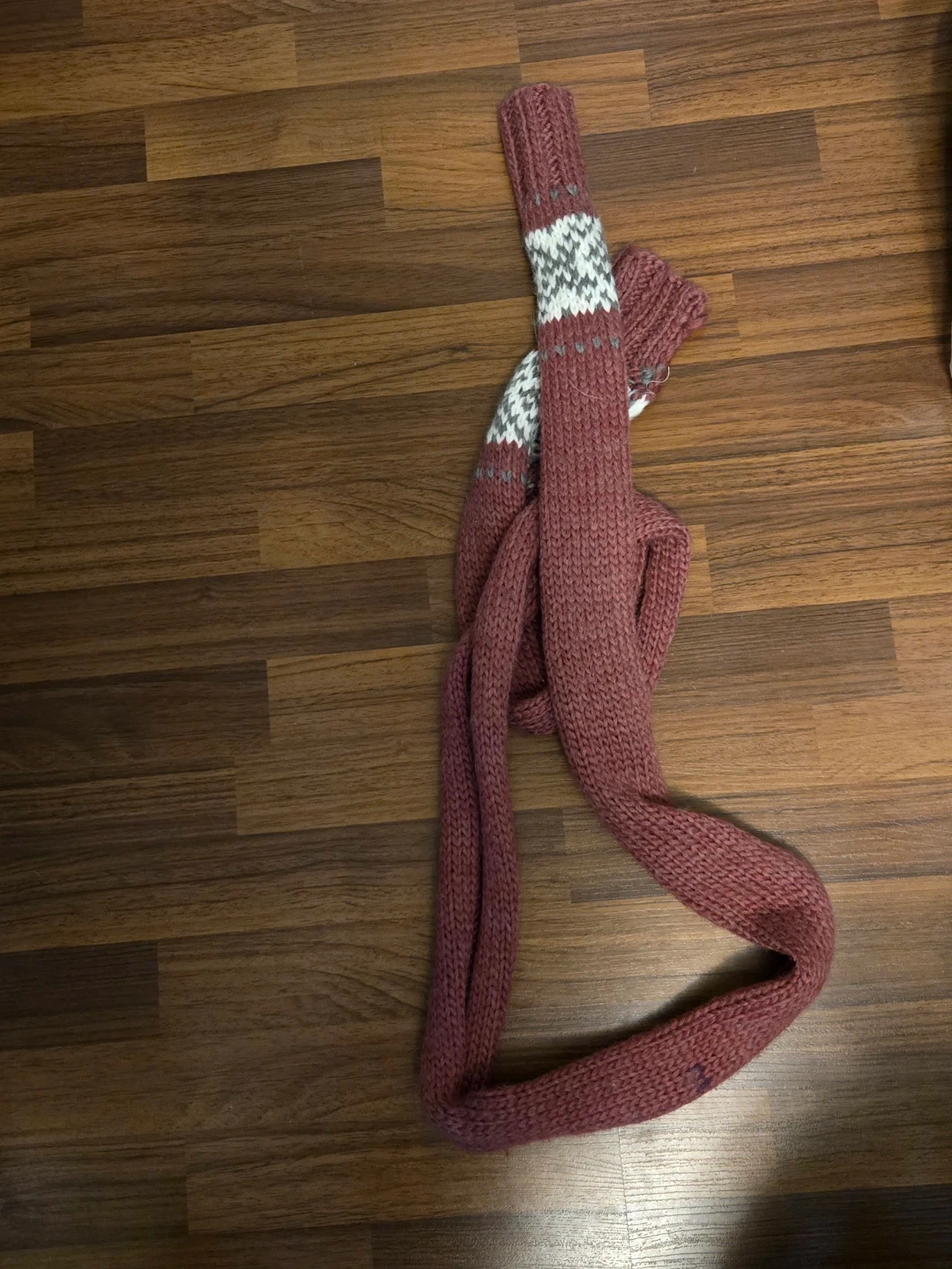 A cozy burgundy knit scarf, perfect for keeping warm during the colder months! It features a unique knit pattern and a stylish design at the ends. Great for adding a pop of colour to any outfit