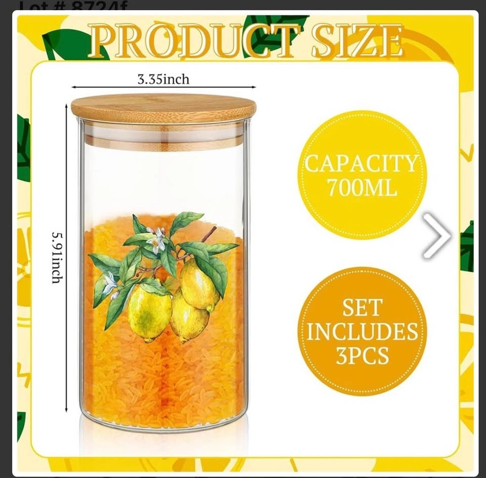 You will receive 3 food storage jars, each 24 oz, suitable for jams, rice, sugar, tea, coffee, spices, and more. These kitchen glass storage containers are made from strong borosilicate glass, with silicone sealing rings. Hand washing is recommended. They can withstand temperature changes. The jars feature an attractive lemon pattern, adding charm to your kitchen and serving as a decorative item. The airtight bamboo lids help keep food fresh and dry. Let me know if you're interested!
