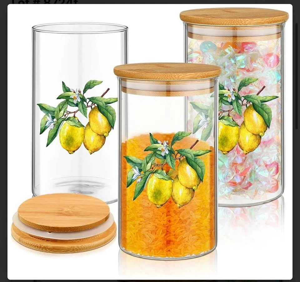 You will receive 3 food storage jars, each 24 oz, suitable for jams, rice, sugar, tea, coffee, spices, and more. These kitchen glass storage containers are made from strong borosilicate glass, with silicone sealing rings. Hand washing is recommended. They can withstand temperature changes. The jars feature an attractive lemon pattern, adding charm to your kitchen and serving as a decorative item. The airtight bamboo lids help keep food fresh and dry. Let me know if you're interested!