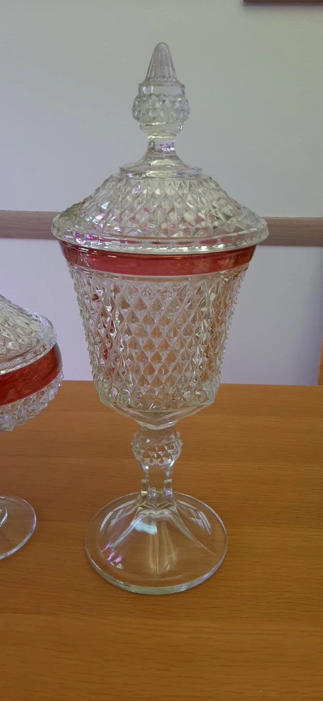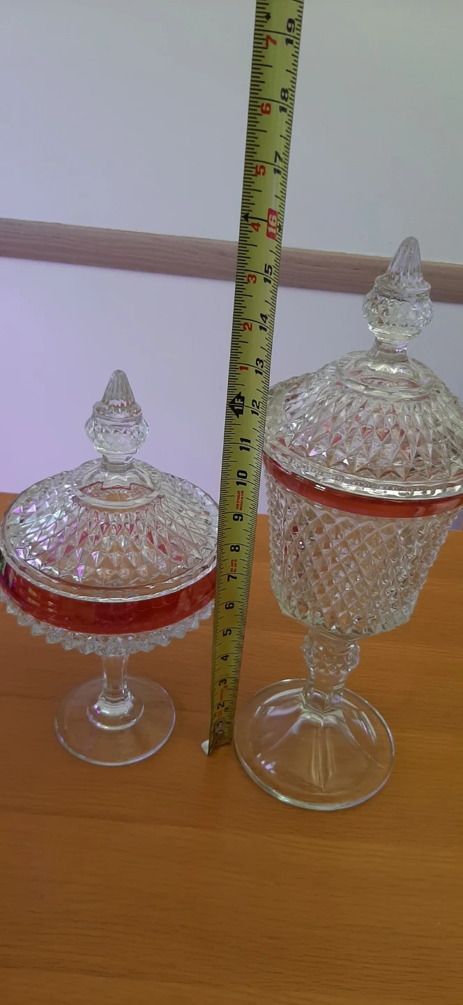 Indiana Glass Diamond Point Ruby lidded compotes or candy dishes featuring a clear diamond-patterned glass with a ruby red flash band. They were produced in the United States, commonly featuring a tall pedestal base and a lidded urn style. The pattern is known for its distinct, crisp diamond-cut design. No chips or cracks. $50. for the pair or $35. each