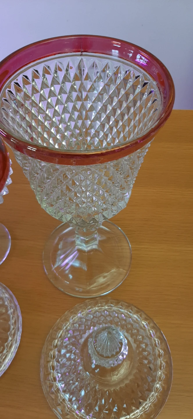 Indiana Glass Diamond Point Ruby lidded compotes or candy dishes featuring a clear diamond-patterned glass with a ruby red flash band. They were produced in the United States, commonly featuring a tall pedestal base and a lidded urn style. The pattern is known for its distinct, crisp diamond-cut design. No chips or cracks. $50. for the pair or $35. each
