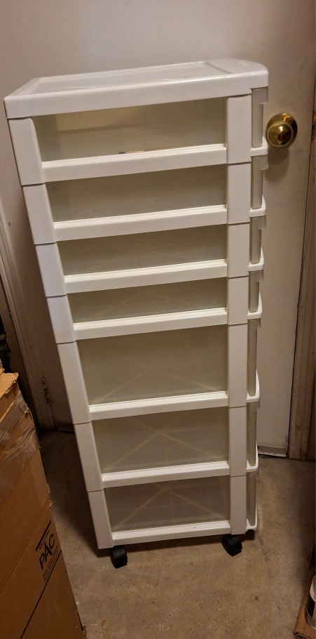 Selling a handy white frame storage cart with seven drawers! It's on wheels, so it's easy to move around. Perfect for organizing your space!