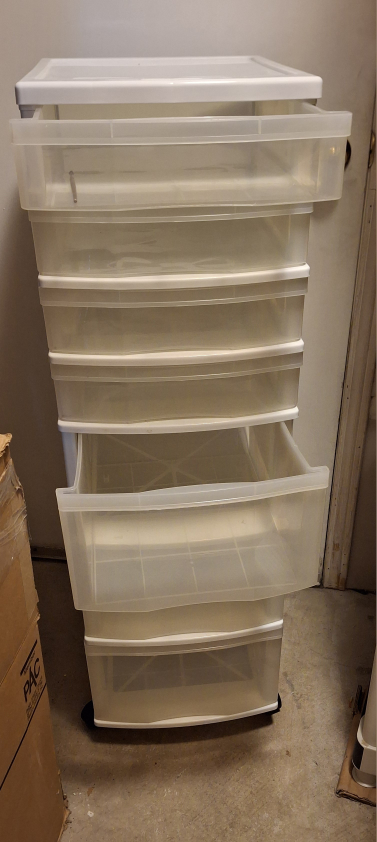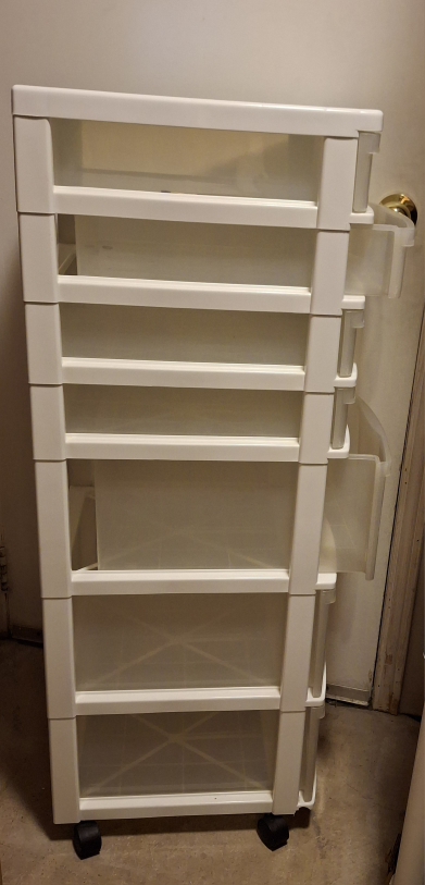 Selling a handy white frame storage cart with seven drawers! It's on wheels, so it's easy to move around. Perfect for organizing your space!