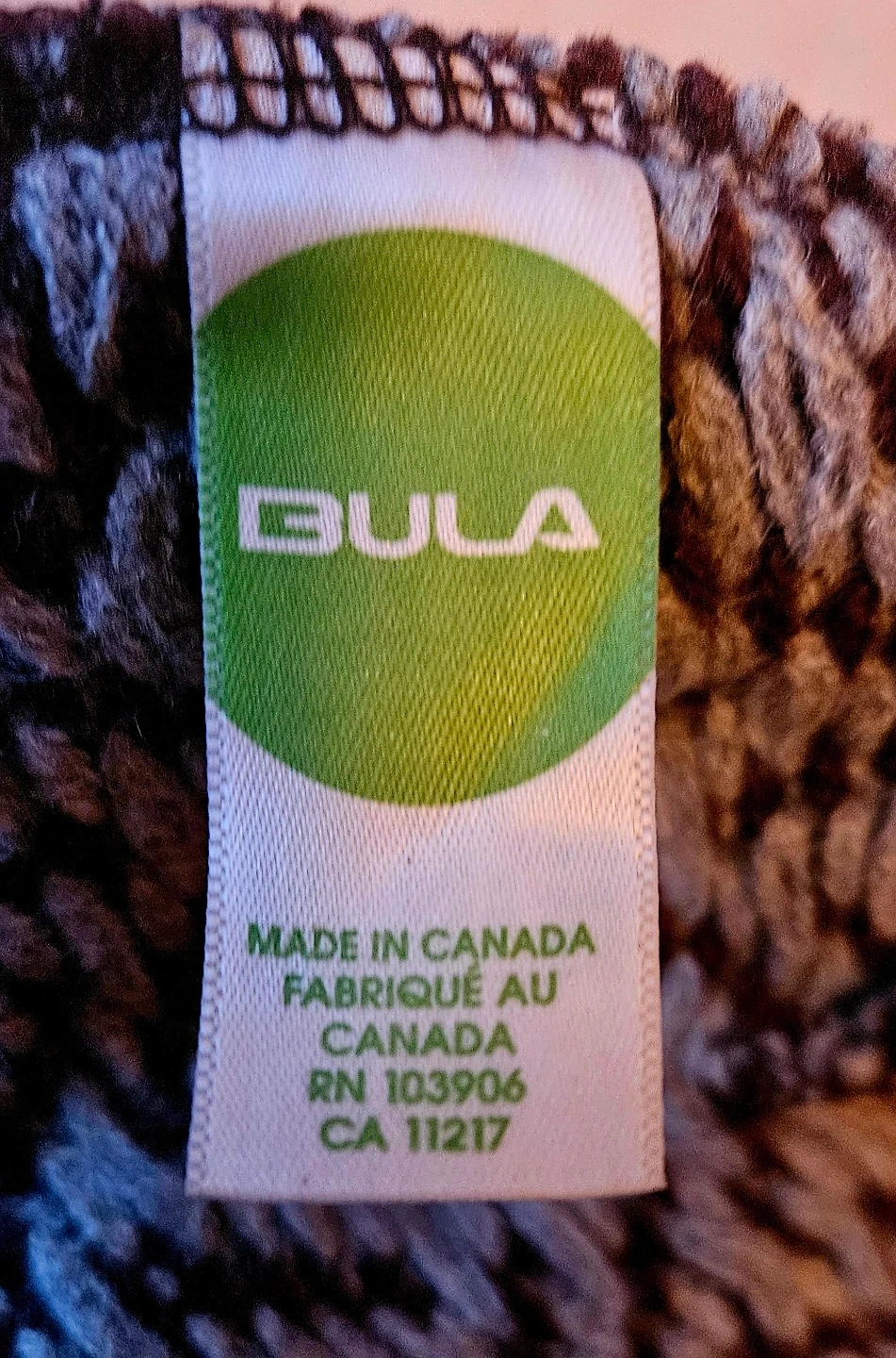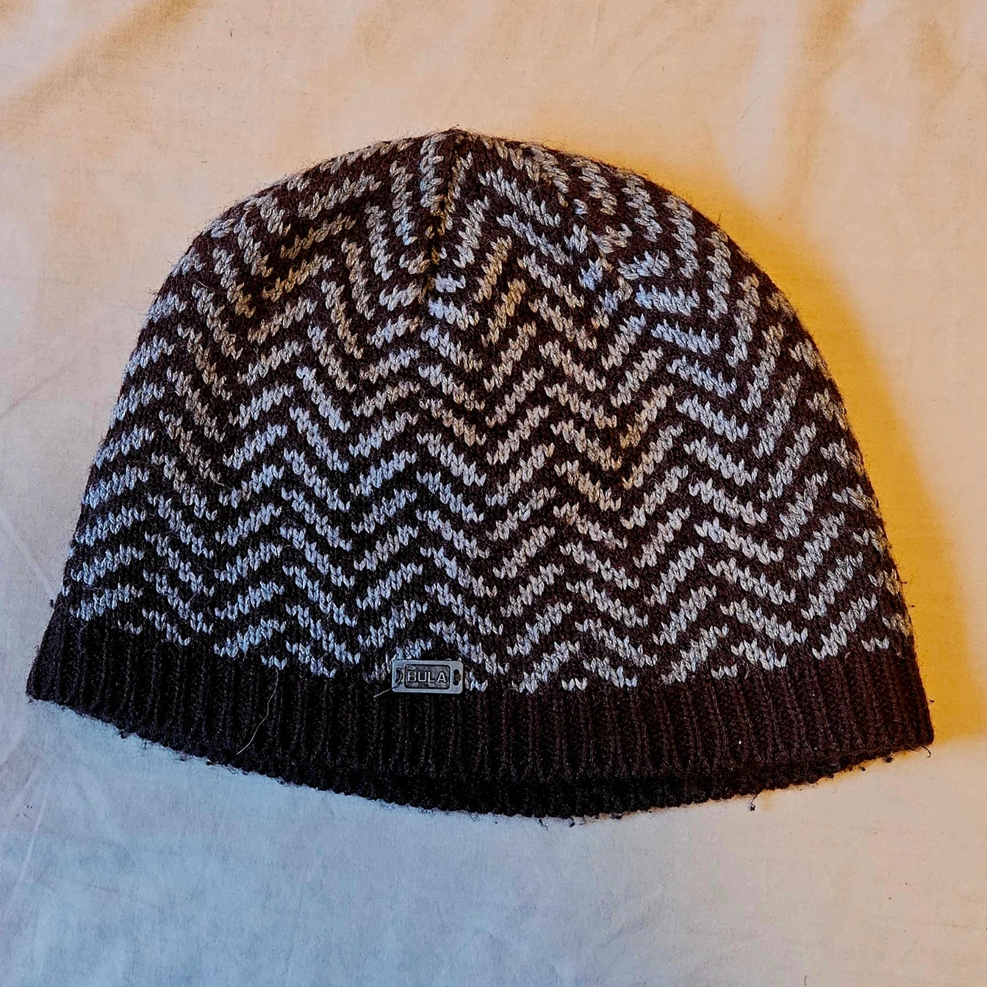 BULA knit hat featuring a brown and white zigzag pattern. It's made in Canada. This toque is great for keeping warm on cooler days!