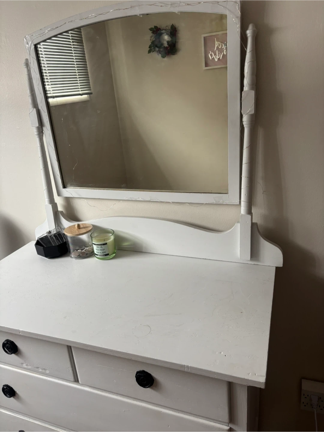 I got this beautiful dresser a couple of months ago off Facebook marketplace, unfortunately have to part with it due to moving. This timeless piece was the star of the show in my bedroom. Some minor scuffs, could use a paint job. (I was going to paint it pink, it’s white so you can have fun with it)