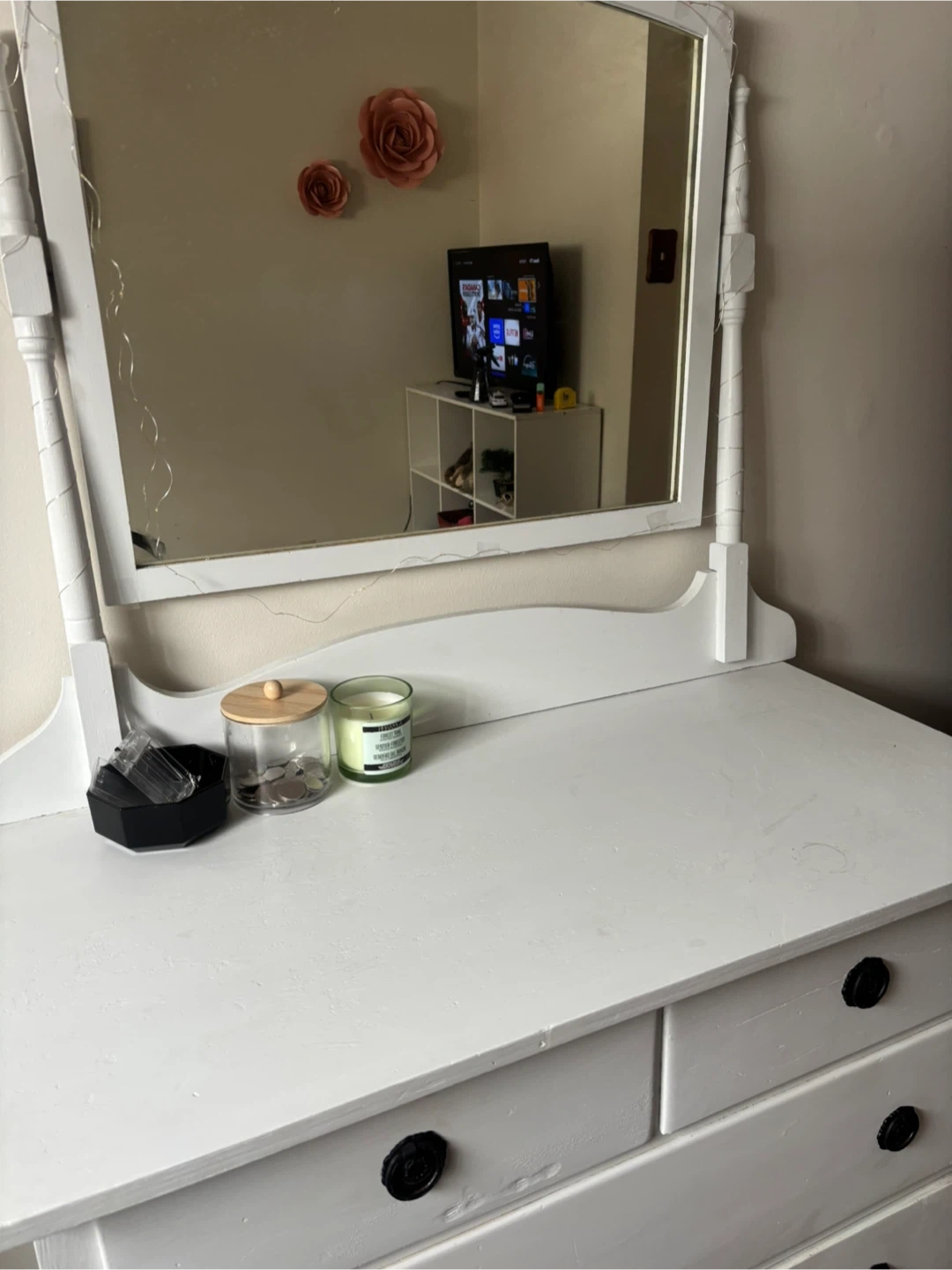 I got this beautiful dresser a couple of months ago off Facebook marketplace, unfortunately have to part with it due to moving. This timeless piece was the star of the show in my bedroom. Some minor scuffs, could use a paint job. (I was going to paint it pink, it’s white so you can have fun with it)