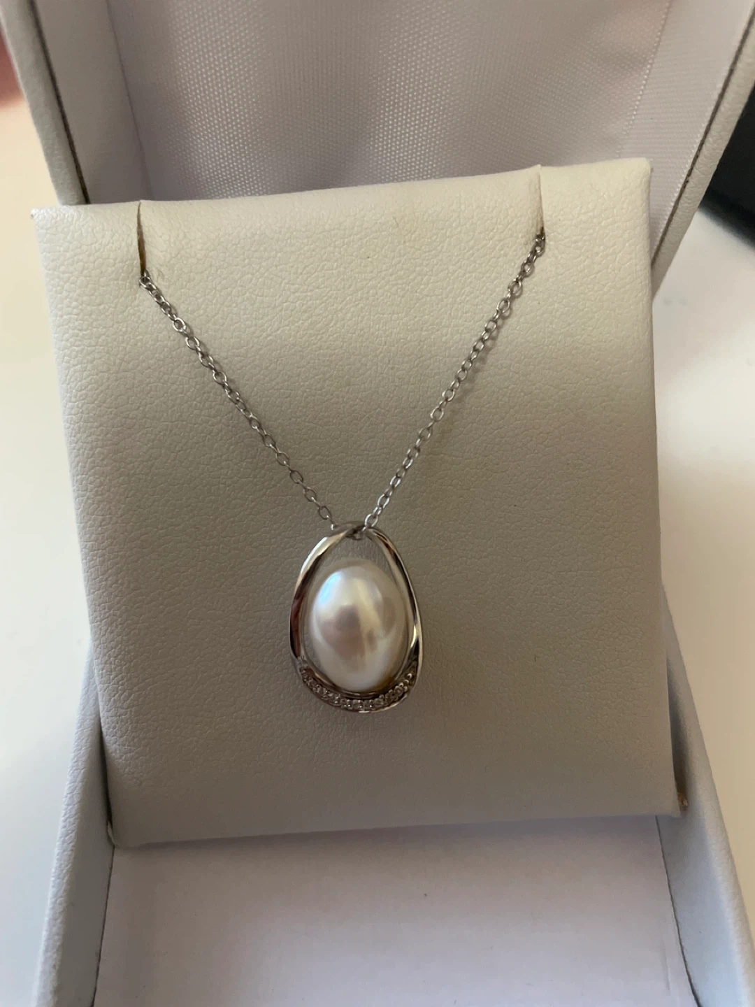 This necklace features a lustrous pearl pendant set in a silver-toned frame, suspended from a delicate silver chain. It comes presented in a blue gift box, ready for gifting or safekeeping. This piece adds a touch of classic elegance to any outfit.