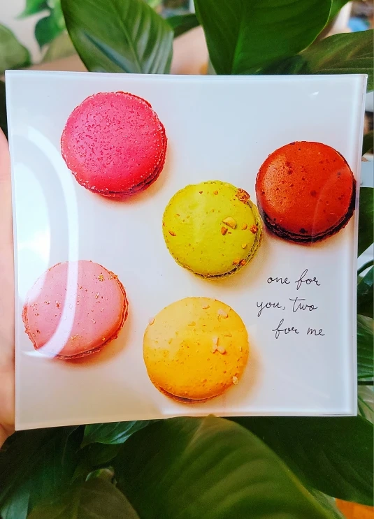 The macaron plate comes from the playful Snap Happy™ collection, featuring the phrase “one for you, two for me” — perfect for serving macarons, pastries, or desserts.
