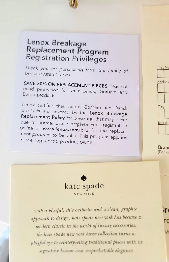 The plate also includes the Lenox Breakage Replacement Program, allowing replacement pieces at 50% off if damaged.