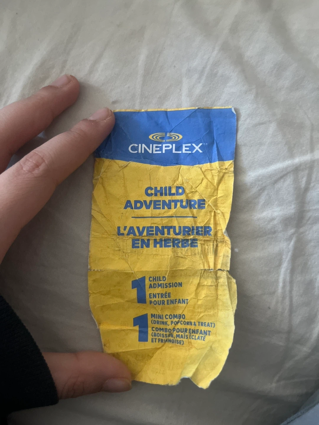 This ticket includes child admission and a mini combo. The mini combo includes a drink, popcorn, and a treat. Very wrinkled but still works. No expiry date. You can scan at at CINEPLEX.
