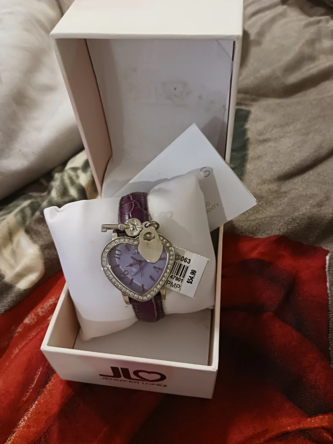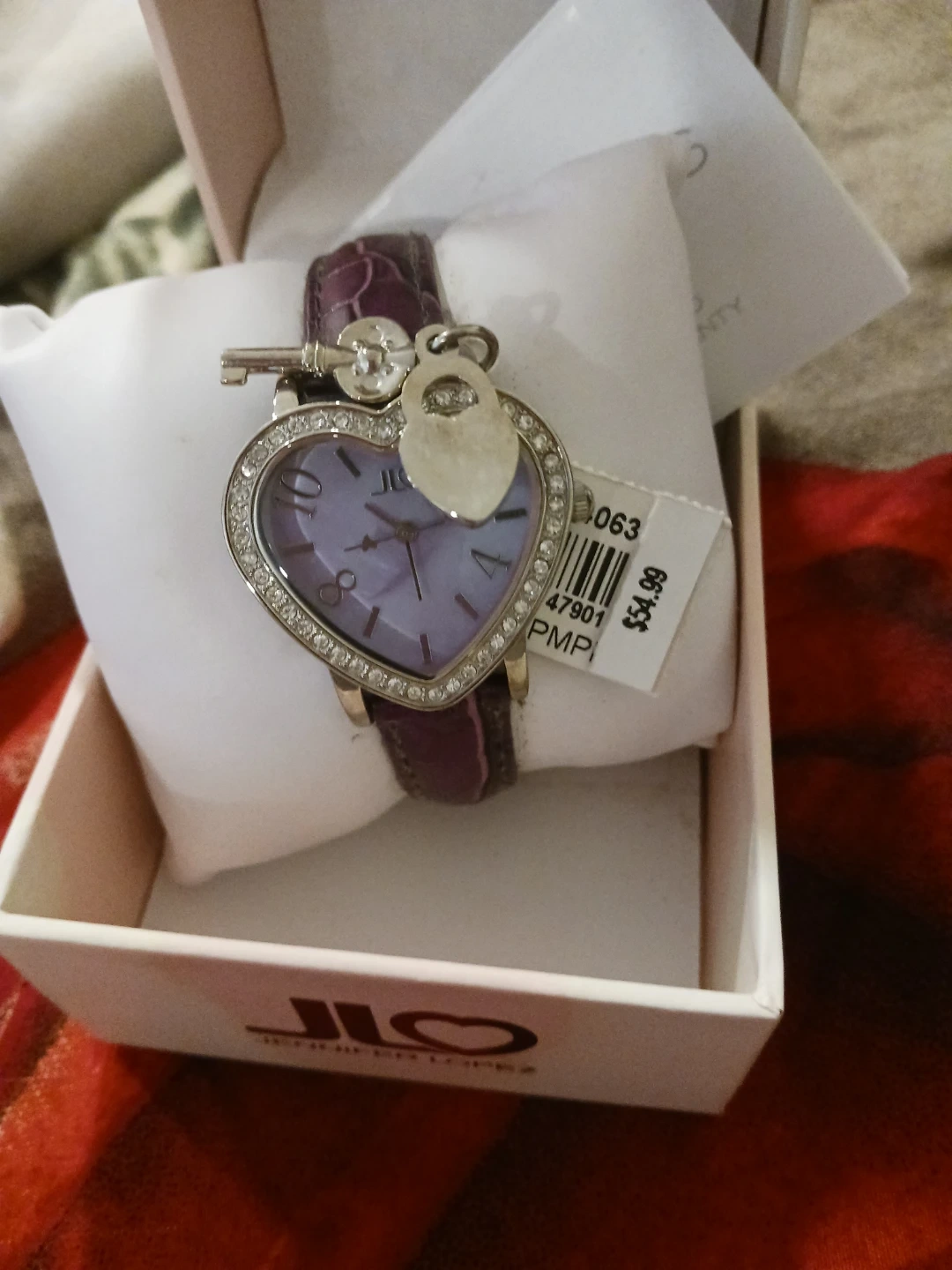 This Jennifer Lopez watch features a heart-shaped lilac face surrounded by rhinestones. It has a purple alligator-textured band and a charming key and lock charm. It comes in its original box with tags still attached.