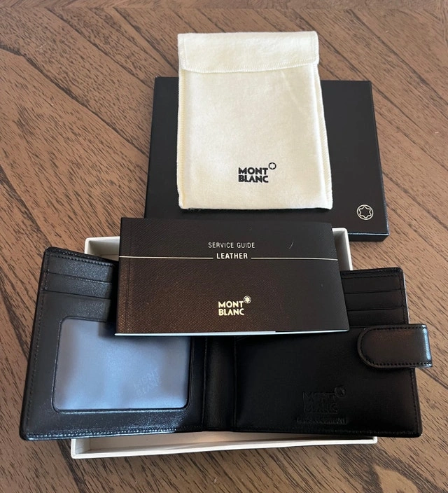 This is a brand new Montblanc wallet in its original packaging, perfect for keeping your cards and cash organized with a touch of luxury. It features premium leather and the iconic Montblanc emblem. It makes for a wonderful gift. Full grain leather, Jacquard lining with Montblanc brand name, Montblanc emblem with palladium-coated ring, 6 pockets for credit cards, 2 compartments for cash. Treat yourself or a loved one to this lovely Montblanc wallet. If the ad is up, it's still available!