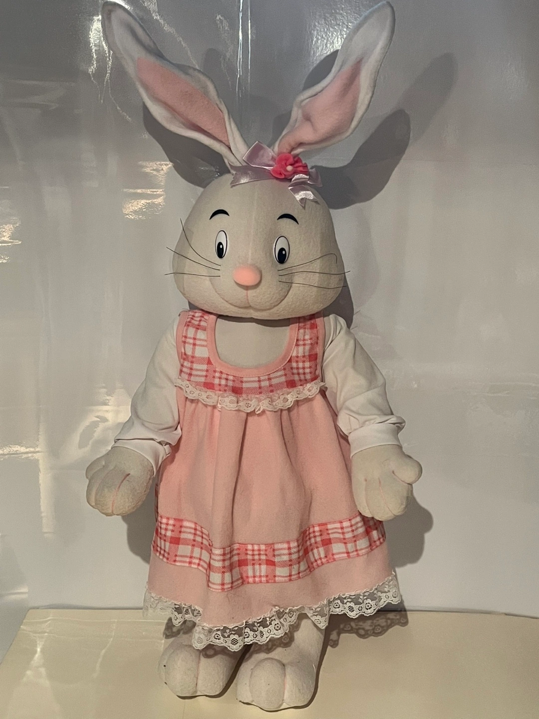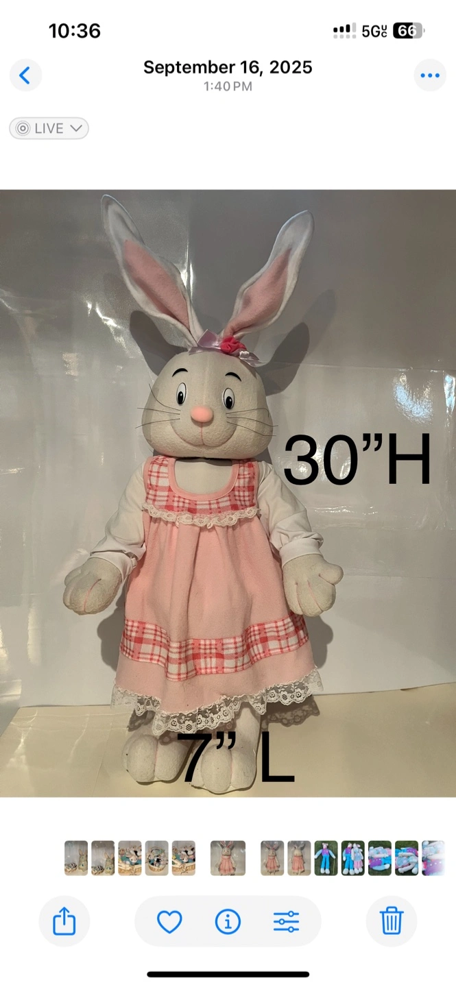 This plush Easter bunny doll is approximately 30 inches tall. It's wearing a white shirt and a pink plaid dress with lace trim. The bunny has a pink bow with a flower on its head.