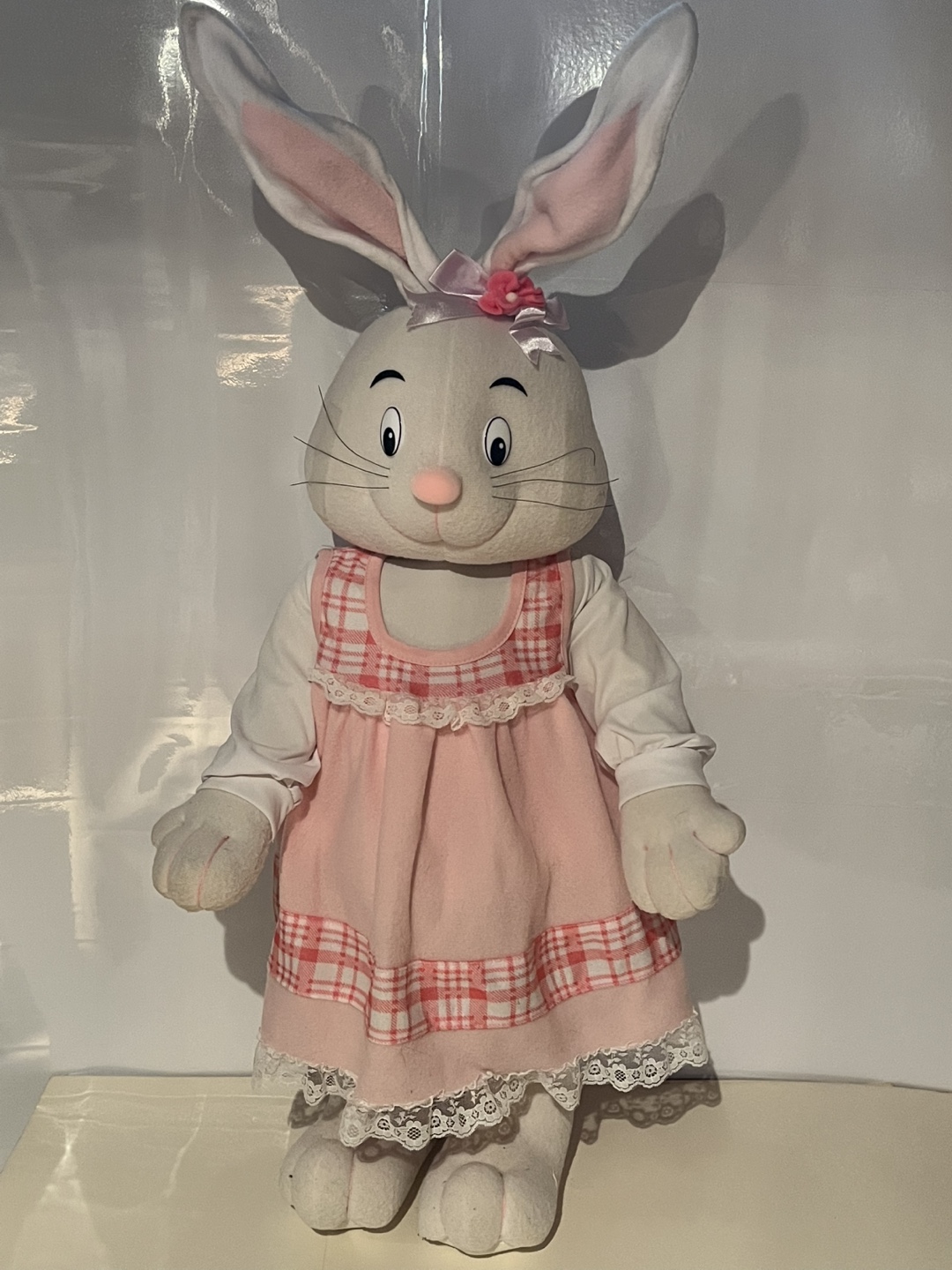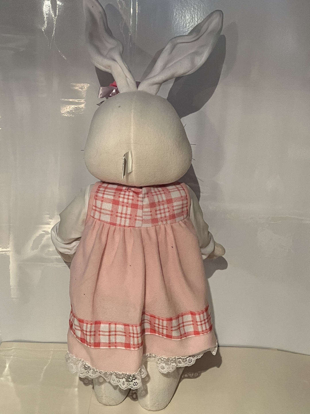 This plush Easter bunny doll is approximately 30 inches tall. It's wearing a white shirt and a pink plaid dress with lace trim. The bunny has a pink bow with a flower on its head.