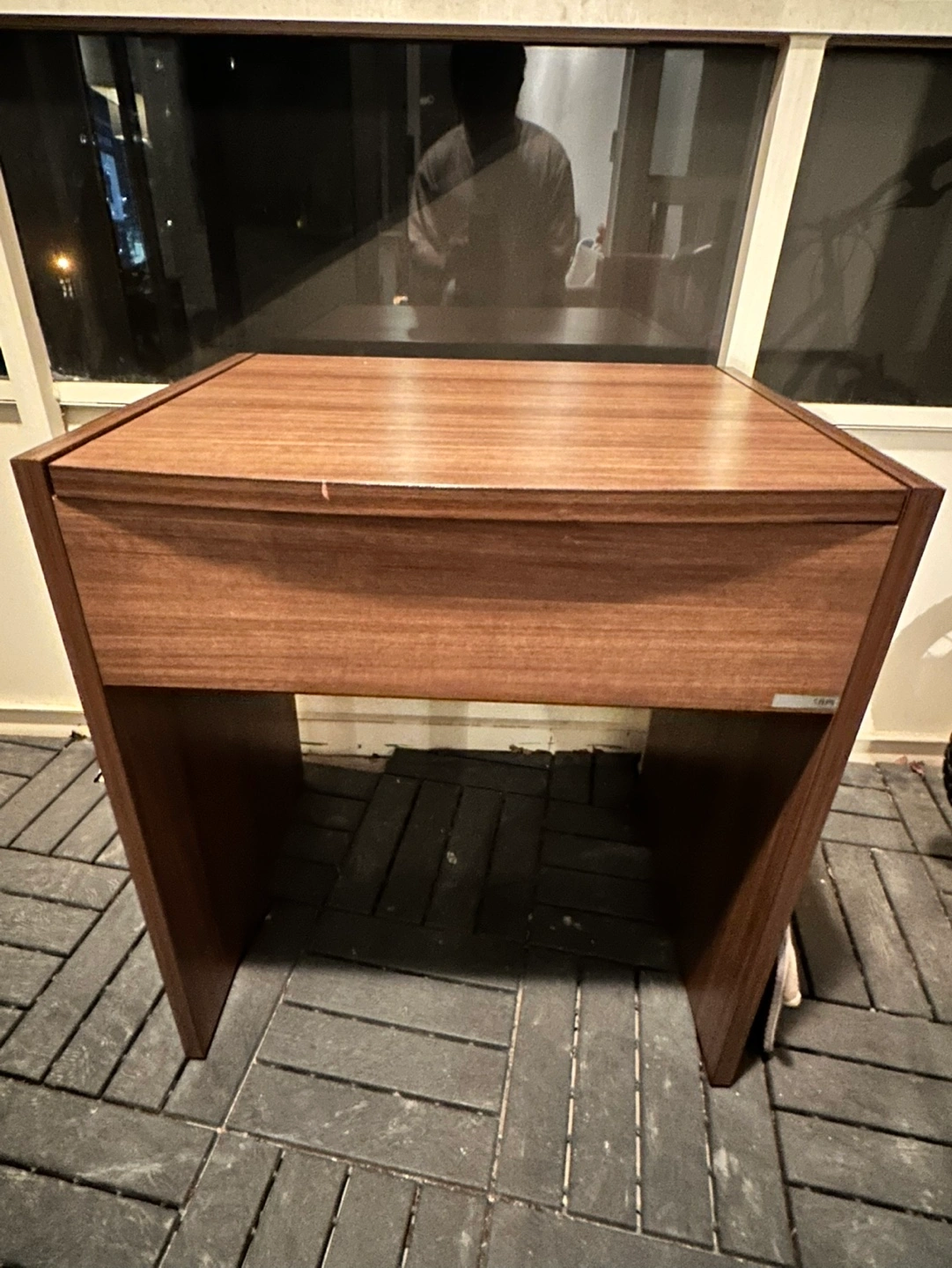Compact vanity with a lift-top mirror. Features a single drawer and internal compartments for organization. Brown wood finish. Good for small spaces.