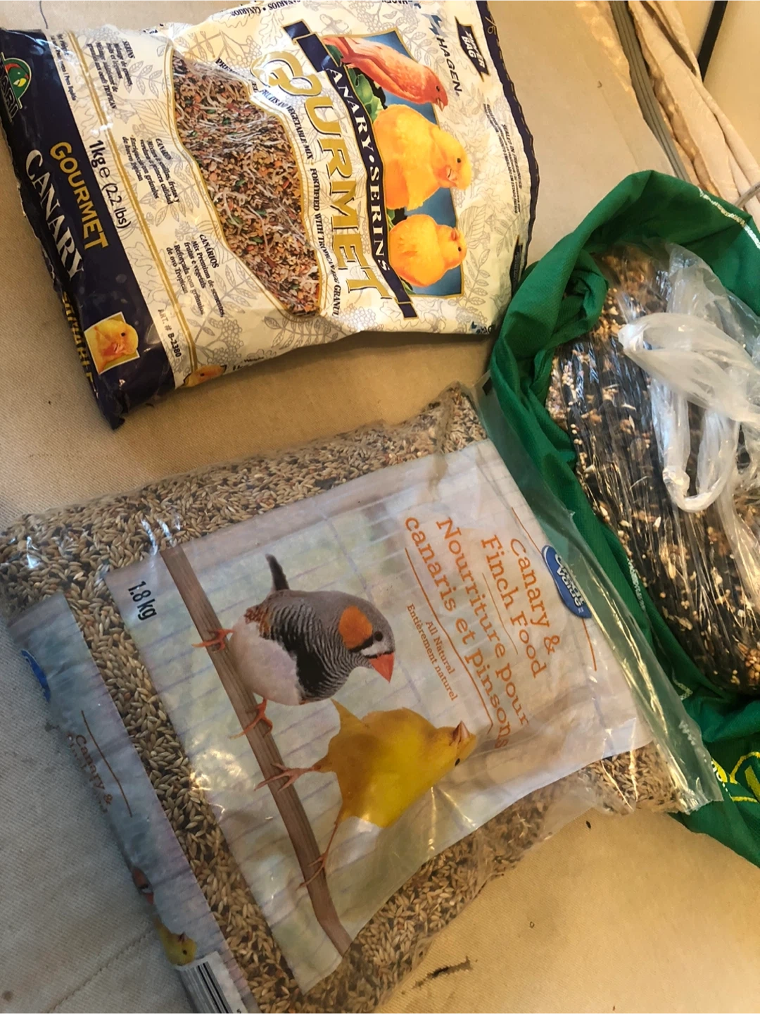 A bag of Hagen Gourmet Canary & Finch bird food. This mix contains seeds, fruits, and vegetables. It's fortified with Tropican granules. An additional 1.8 kg bag of Canary & Finch food is included.