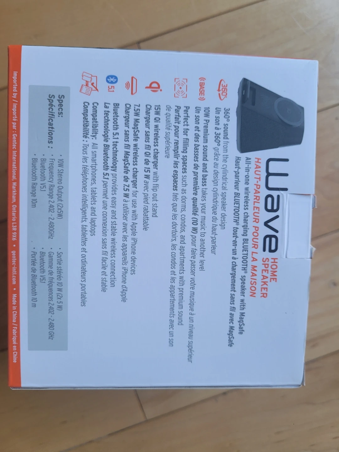This is an iQ Wave all-in-one Bluetooth home speaker with a 15W MagSafe wireless charger. It has 360° sound and a compact cylindrical design. The speaker offers 10W stereo output and Bluetooth 5.1 connectivity. It's perfect for use with smartphones, tablets, and laptops.