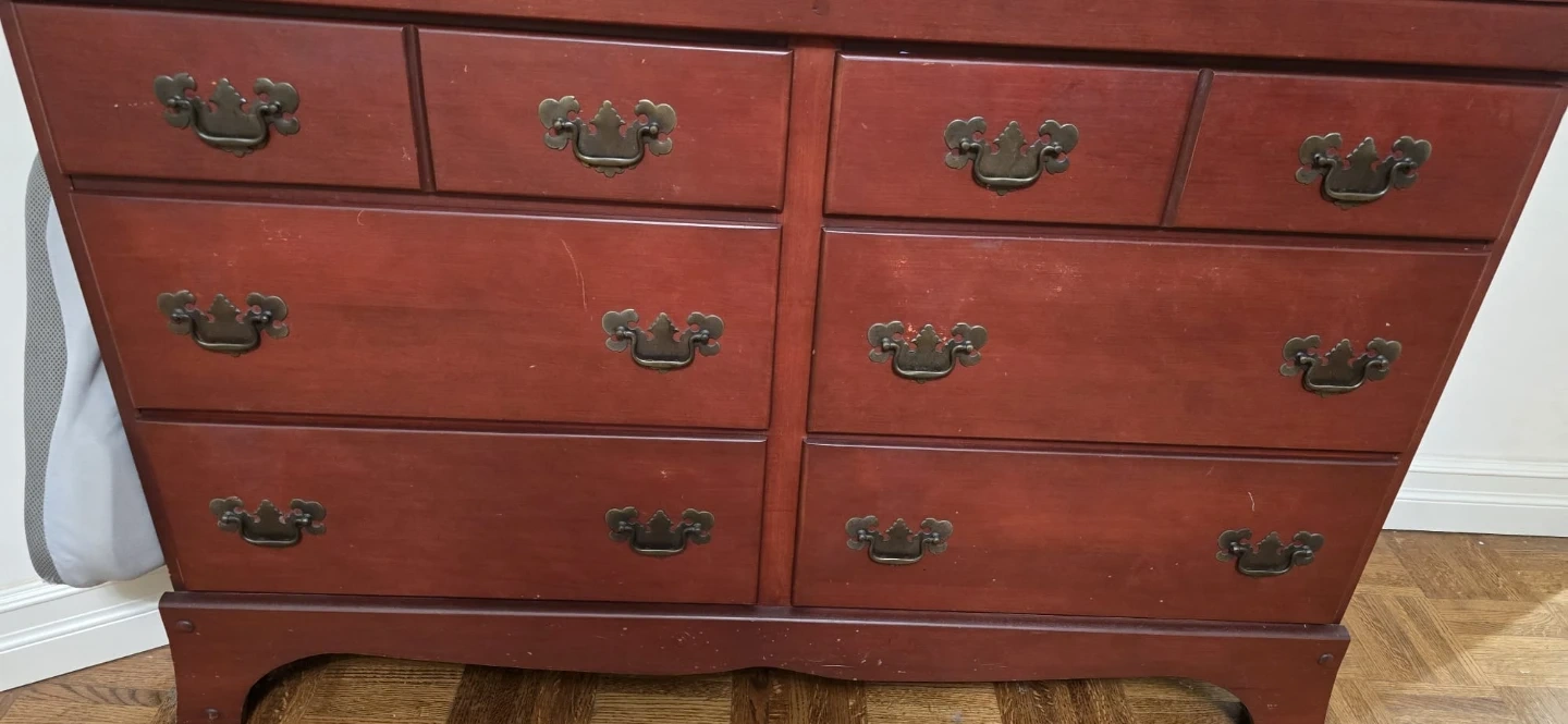 Cherry wood dresser with eight drawers. It has ornate brass-coloured drawer pulls. This dresser offers ample storage space for clothing and linens. Great for organizing a bedroom or guest room!