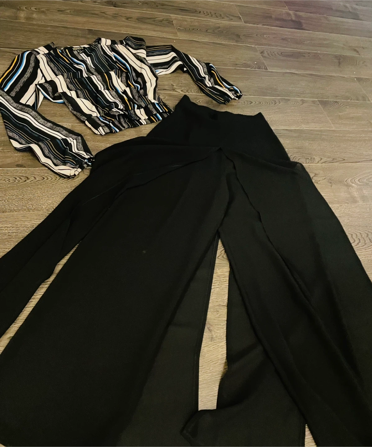 This is a fun two-piece set featuring a striped bardot style top and high-waisted black pants with a split front. The top has a cinched hem and puffed sleeves. The pants offer a flowy silhouette. It's a great outfit for a night out! Worn once