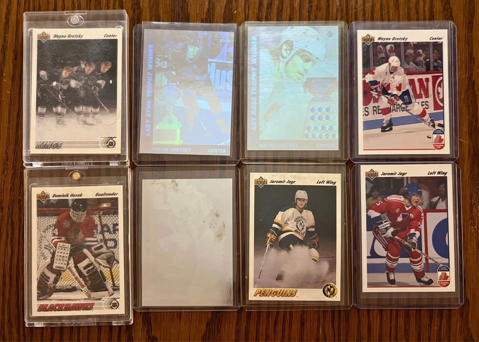 1991 Upper Deck Dominik Hasek Rookie Card, Wayne Gretzky Trophy Winner hologram cards (Lady Byng & Art Ross), Jaromir Jagr (Penguins), Mario Lemieux (Team Canada), and additional Wayne Gretzky cards. All cards are in protective holders. Condition appears good overall with normal light wear possible due to age. Great lot for hockey collectors or fans of 90s NHL legends.