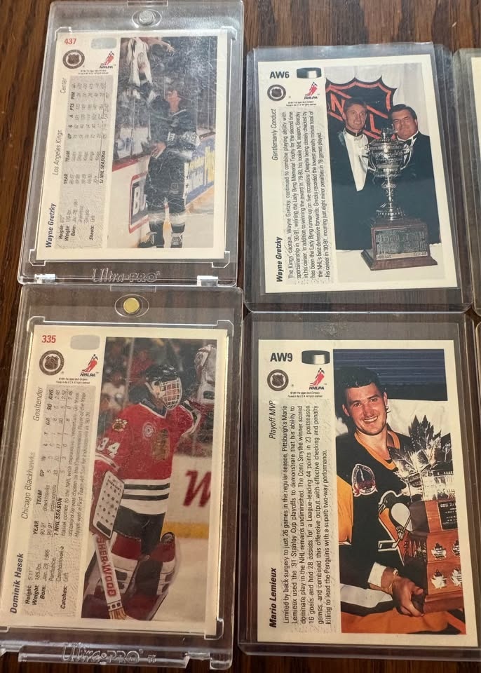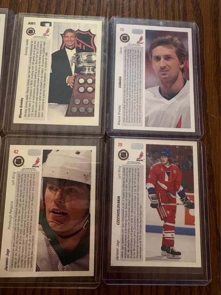 1991 Upper Deck Dominik Hasek Rookie Card, Wayne Gretzky Trophy Winner hologram cards (Lady Byng & Art Ross), Jaromir Jagr (Penguins), Mario Lemieux (Team Canada), and additional Wayne Gretzky cards. All cards are in protective holders. Condition appears good overall with normal light wear possible due to age. Great lot for hockey collectors or fans of 90s NHL legends.