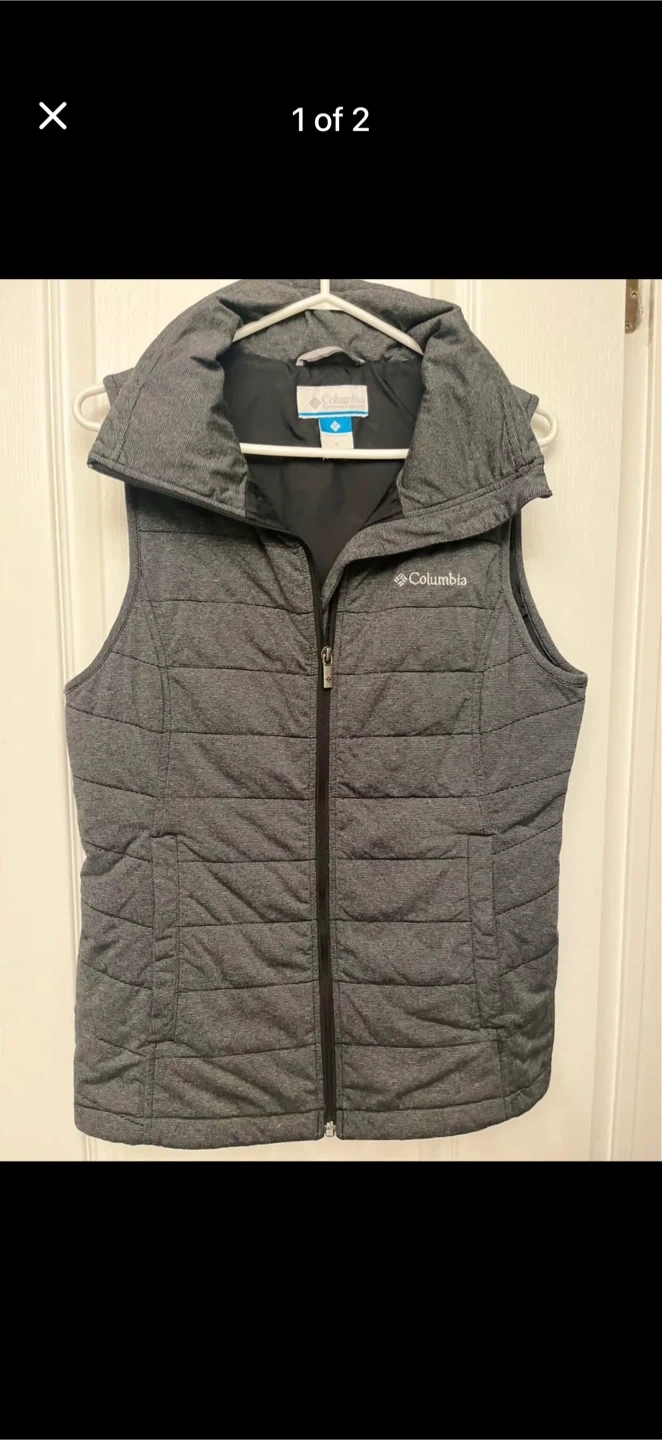 This is a Columbia women's puffer vest in a heather grey colour. It's a size medium and features a full zip front. The vest is quilted for warmth and has a stand-up collar. Great for layering during cooler weather!