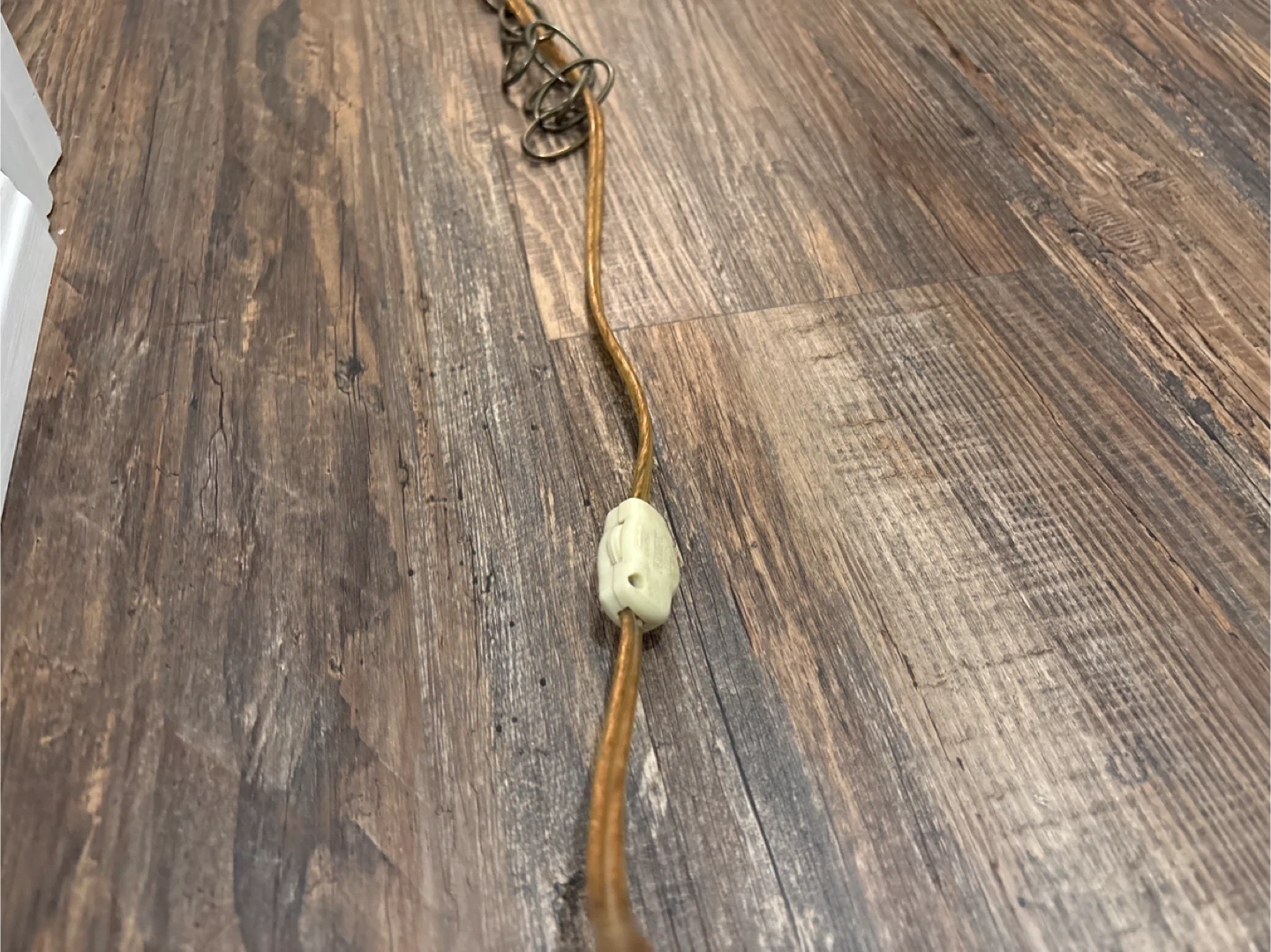 Selling a vintage hanging lamp with a unique fringe design. It adds a touch of retro style to any room! The lamp features a woven shade and long fringe detailing, making it a real statement piece. Comes with 12’ of electrical cord with an on/ off switch and 10’ of chain for ceiling hanging.