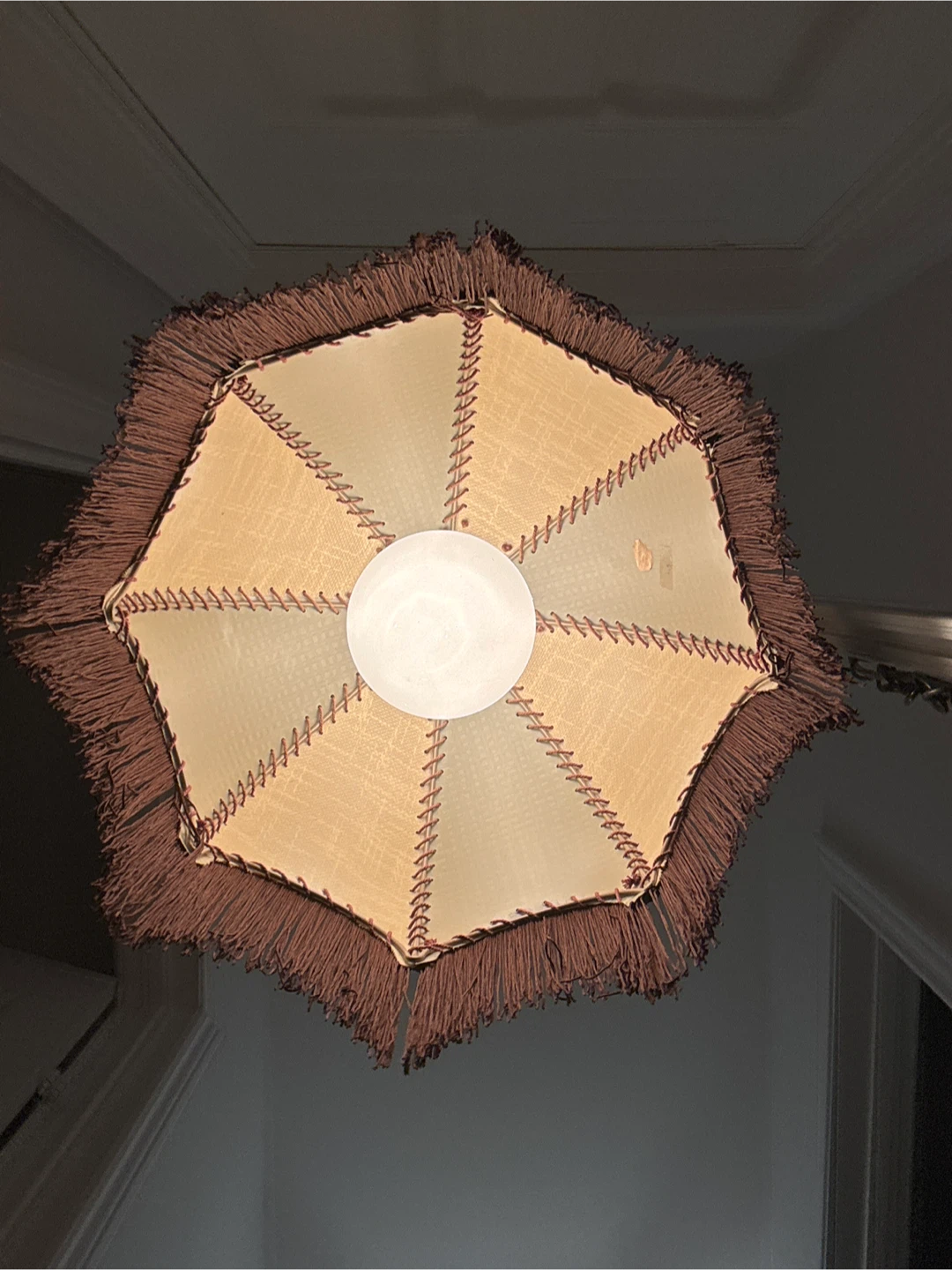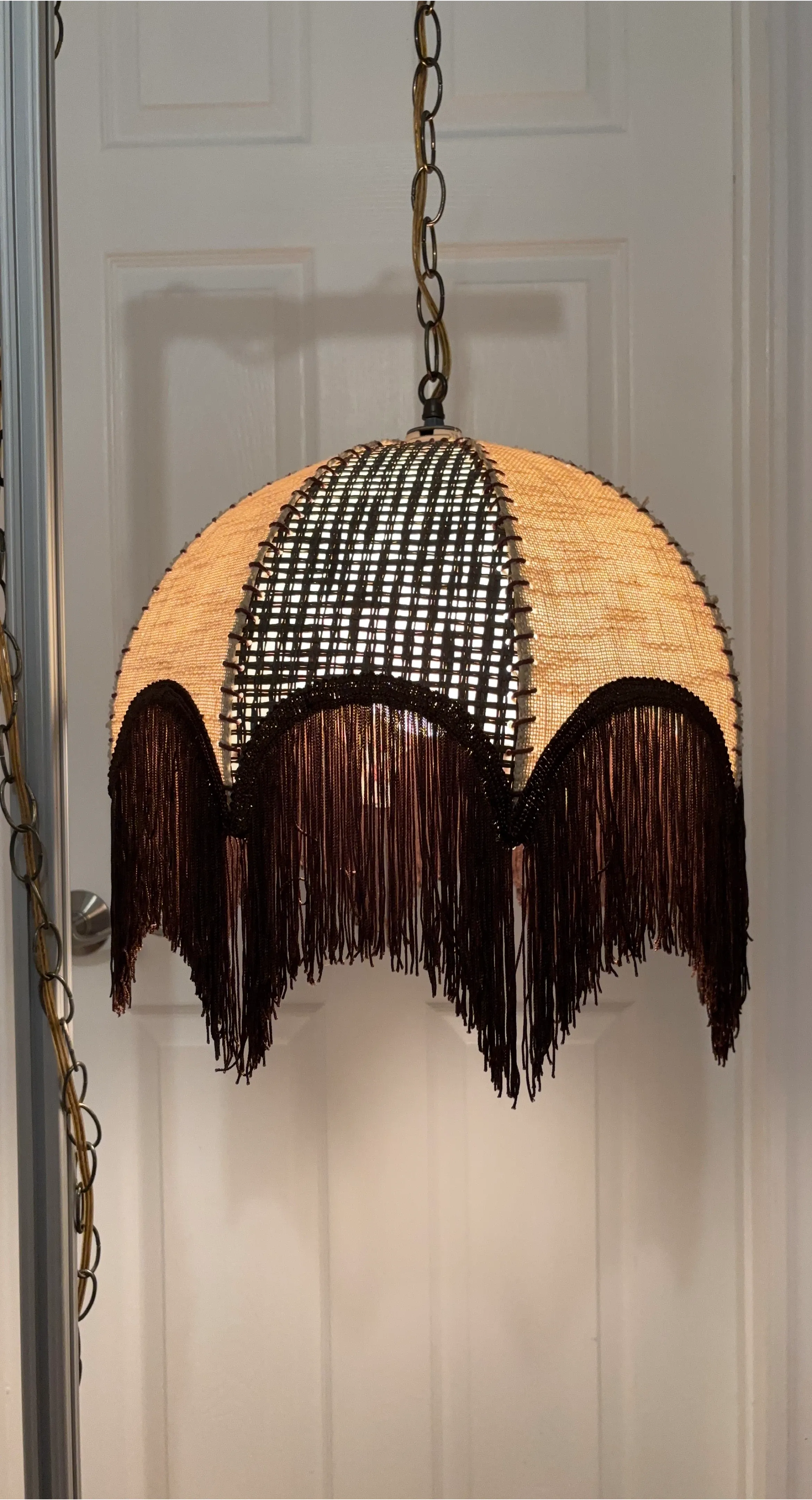 Selling a vintage hanging lamp with a unique fringe design. It adds a touch of retro style to any room! The lamp features a woven shade and long fringe detailing, making it a real statement piece. Comes with 12’ of electrical cord with an on/ off switch and 10’ of chain for ceiling hanging.