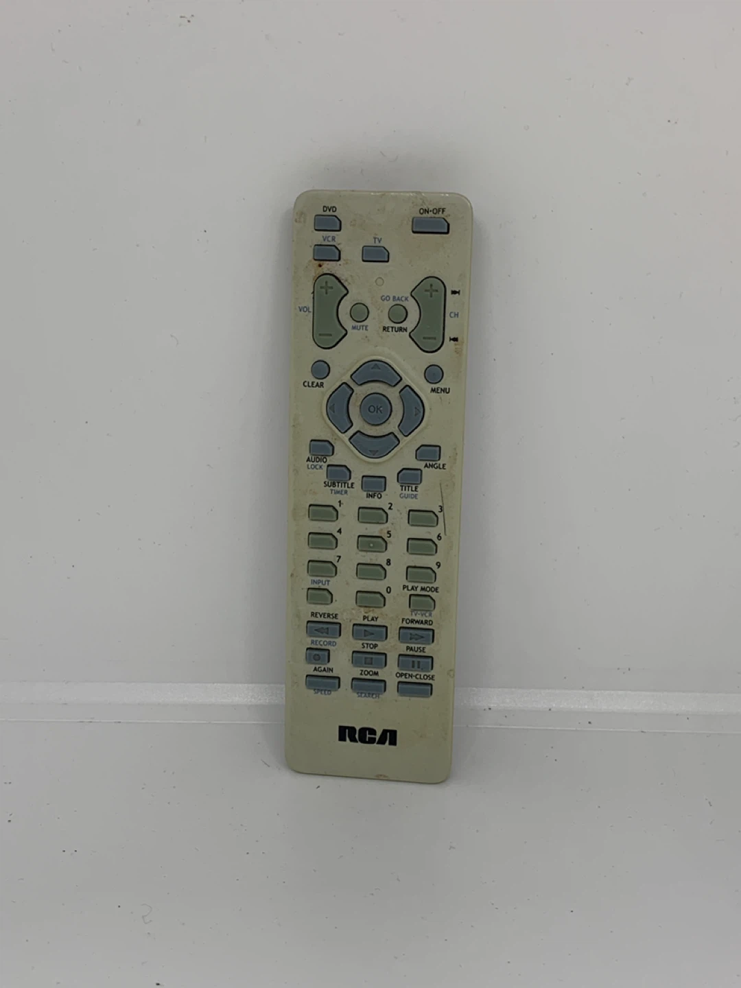 Selling a used RCA remote control. It has buttons for DVD, VCR, TV, and other functions like volume, channel, mute, and menu. It shows signs of wear.