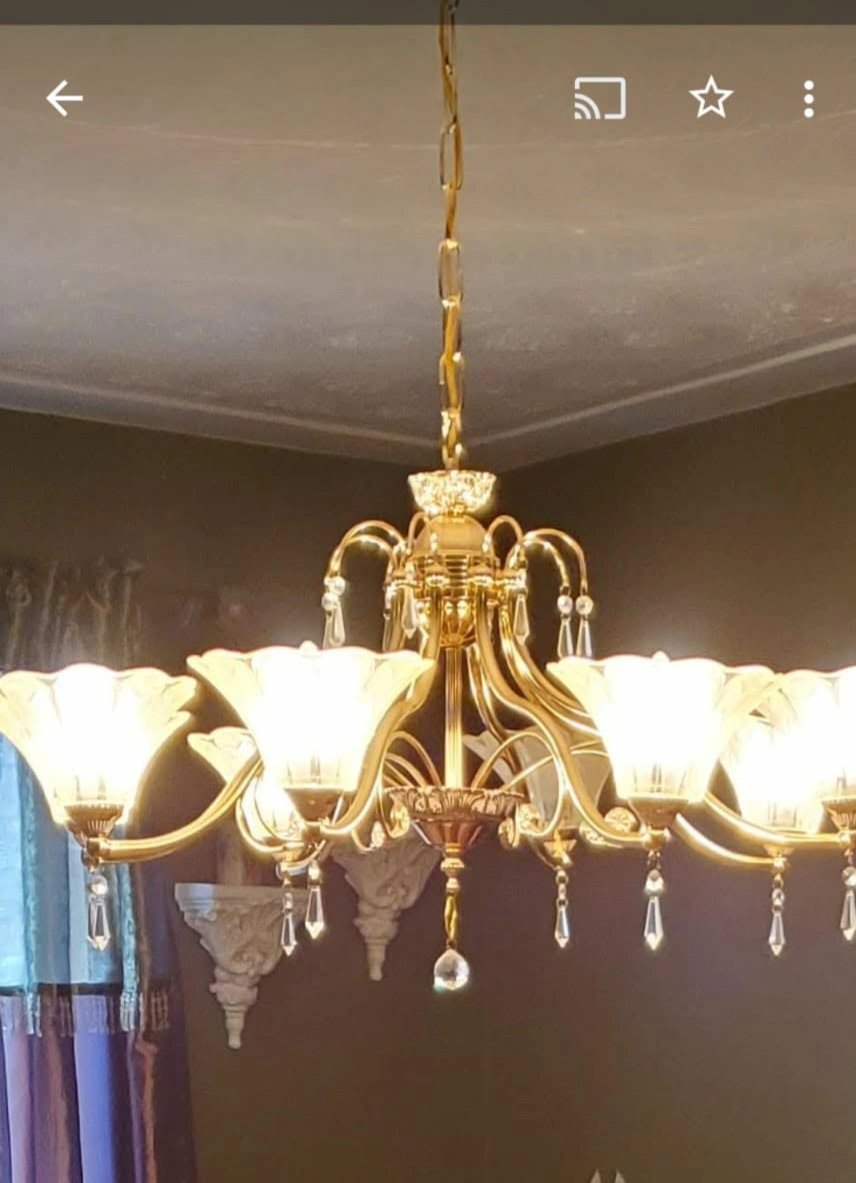 Beautiful gold chandelier with ornate details and crystal accents. It features eight lights with frosted glass shades. Adds a touch of elegance to any room!
