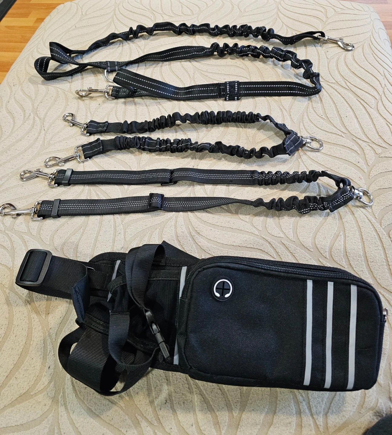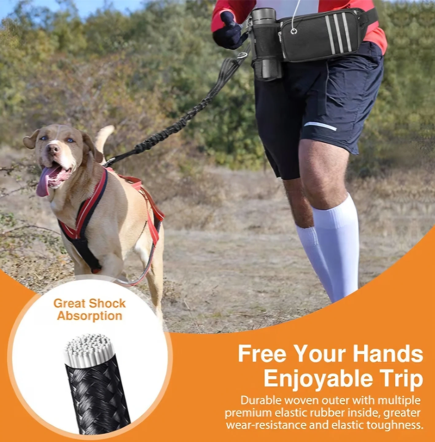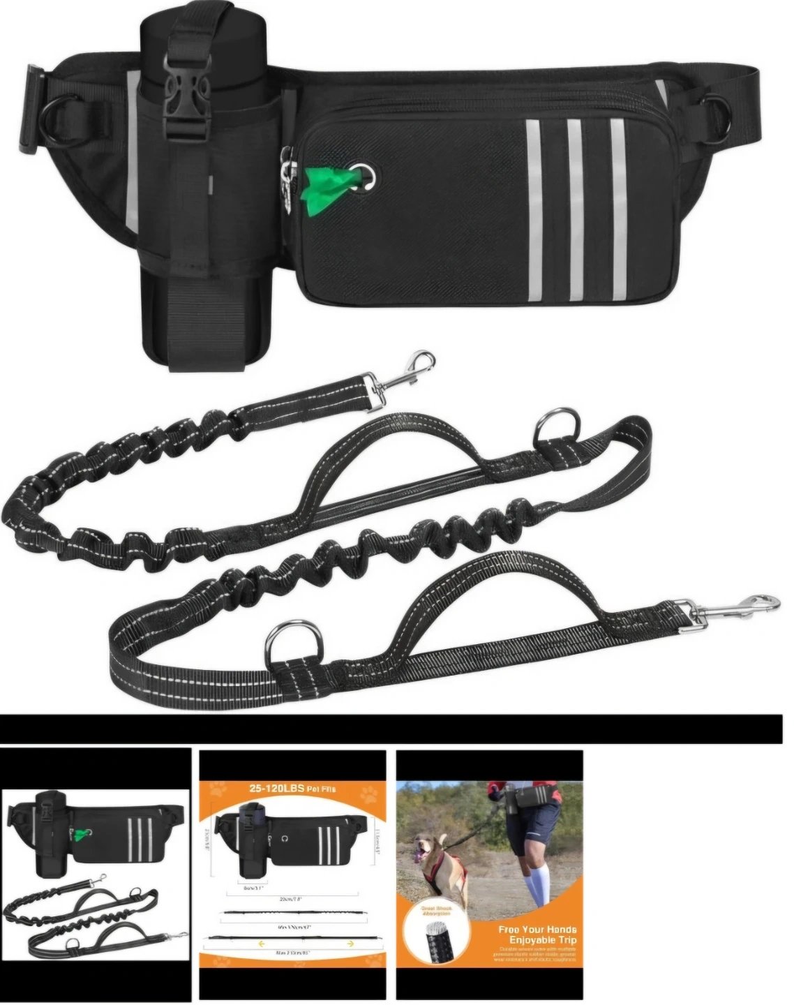 This black hands-free dog leash set includes an adjustable waist belt with multiple compartments and a reinforced bottle holder. It also comes with a shock-absorbing leash, suitable for pets from 25-120 lbs. The leash has two handles for better control and extends from 67" to 83".
