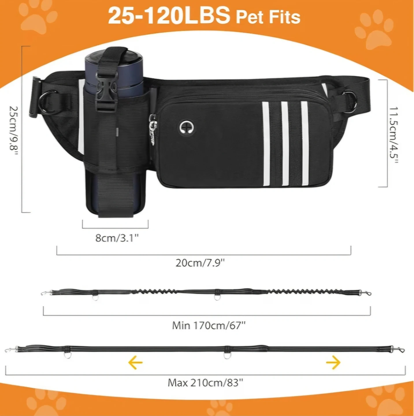 This black hands-free dog leash set includes an adjustable waist belt with multiple compartments and a reinforced bottle holder. It also comes with a shock-absorbing leash, suitable for pets from 25-120 lbs. The leash has two handles for better control and extends from 67" to 83".