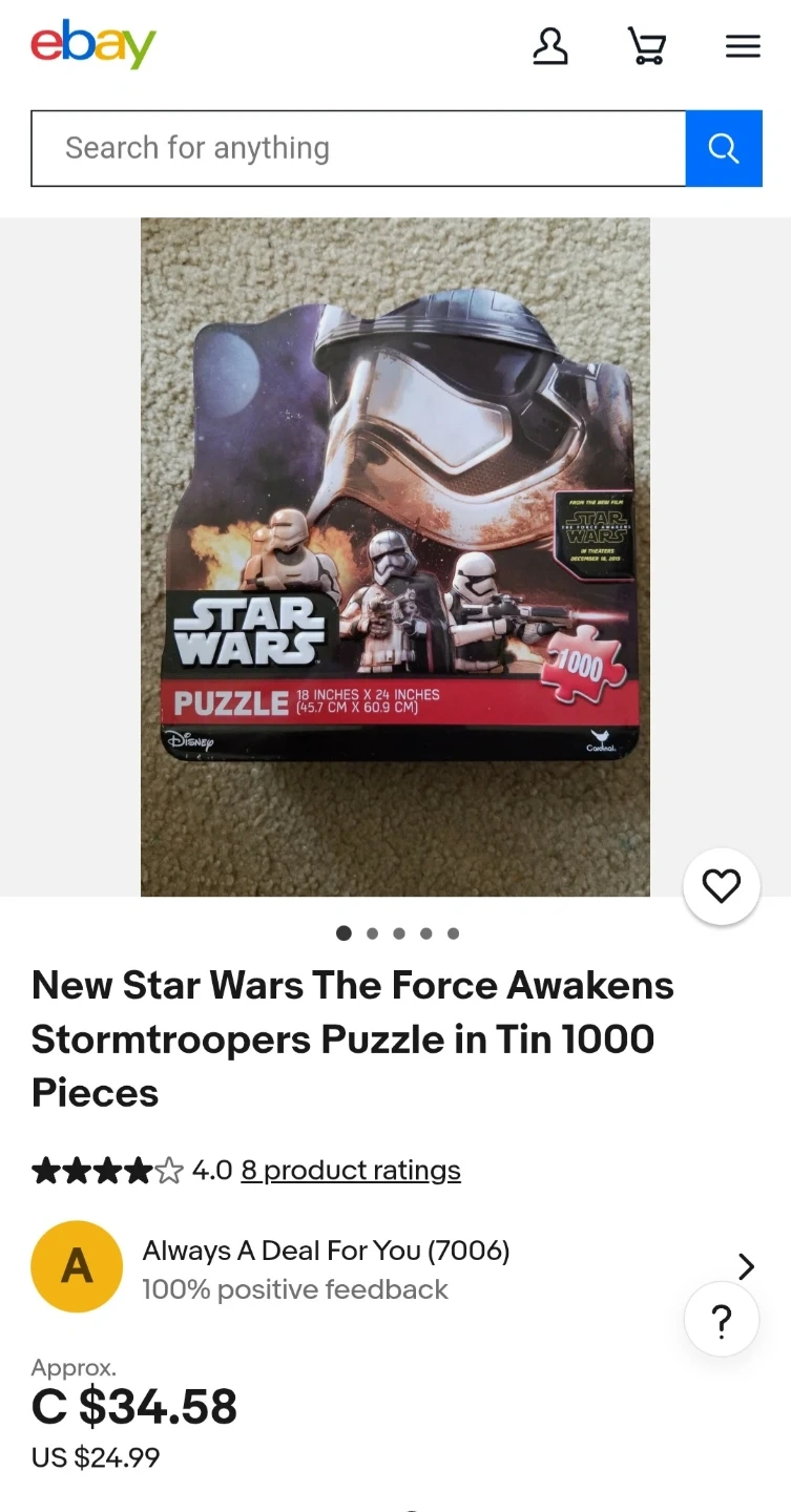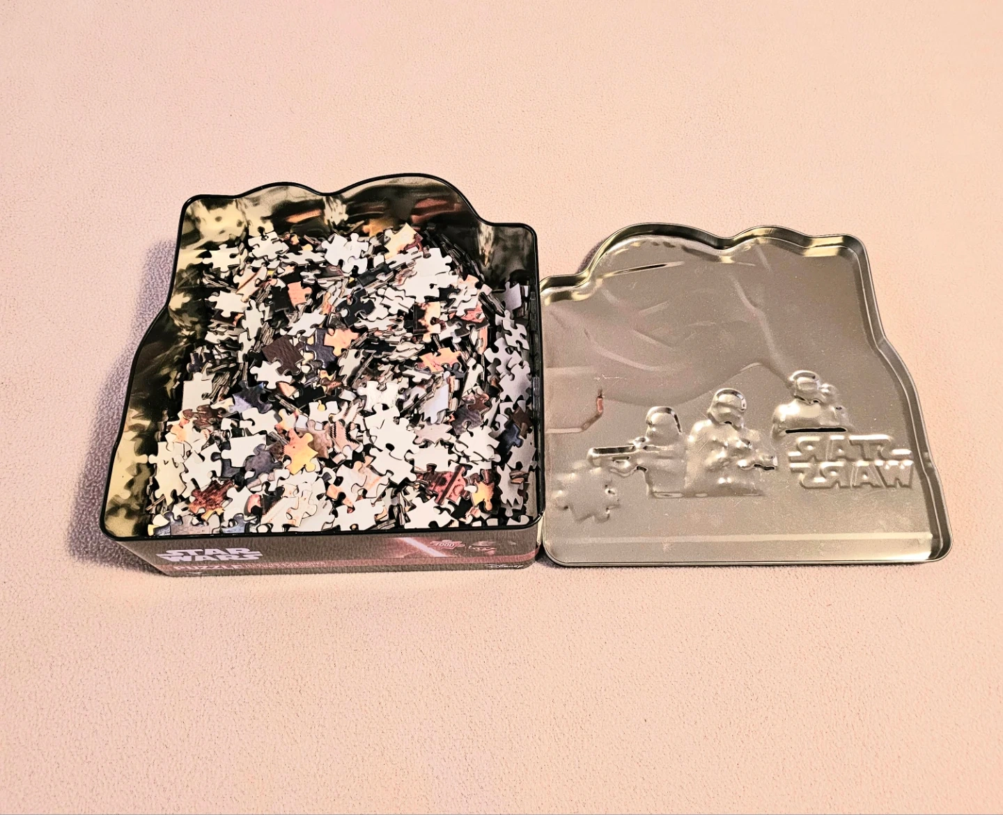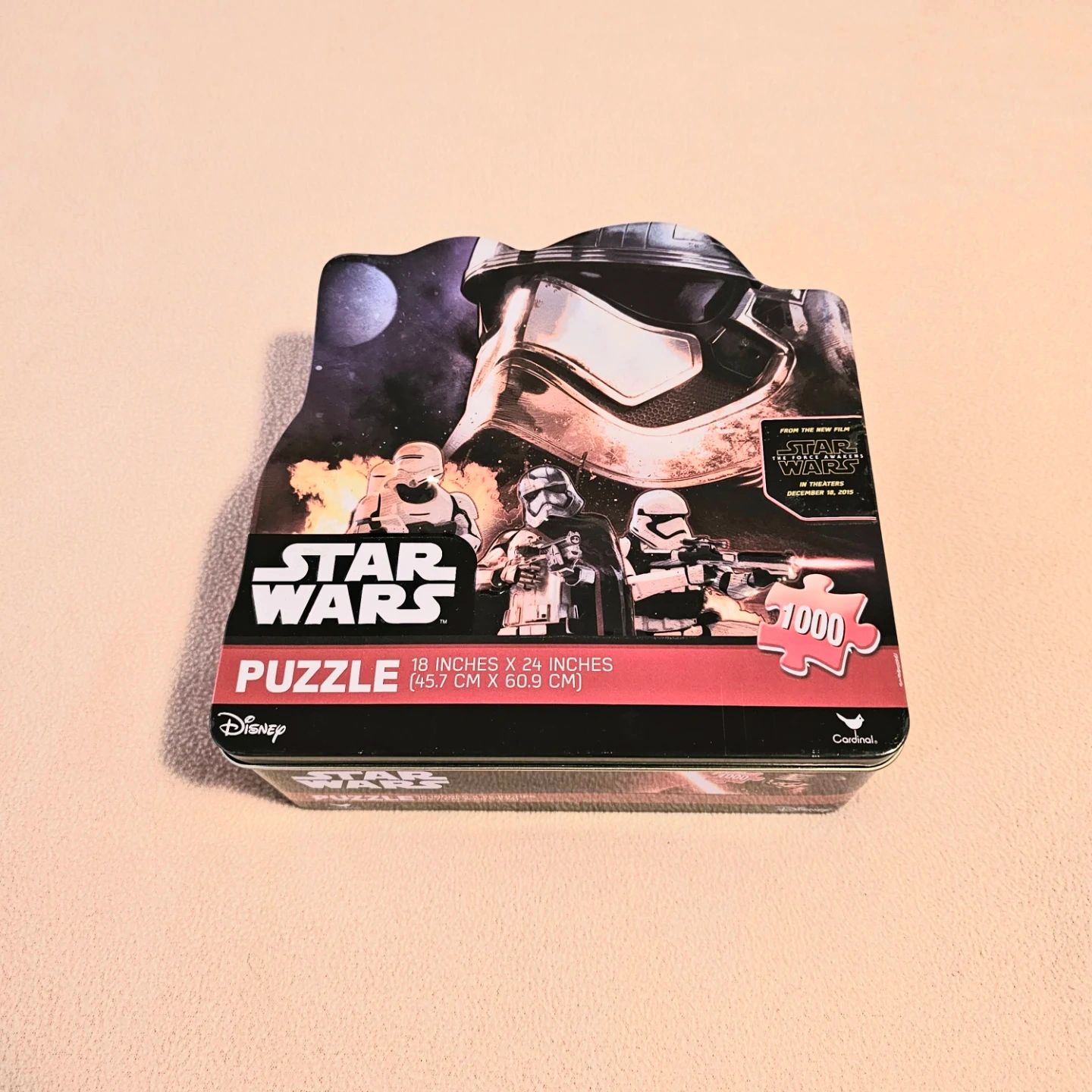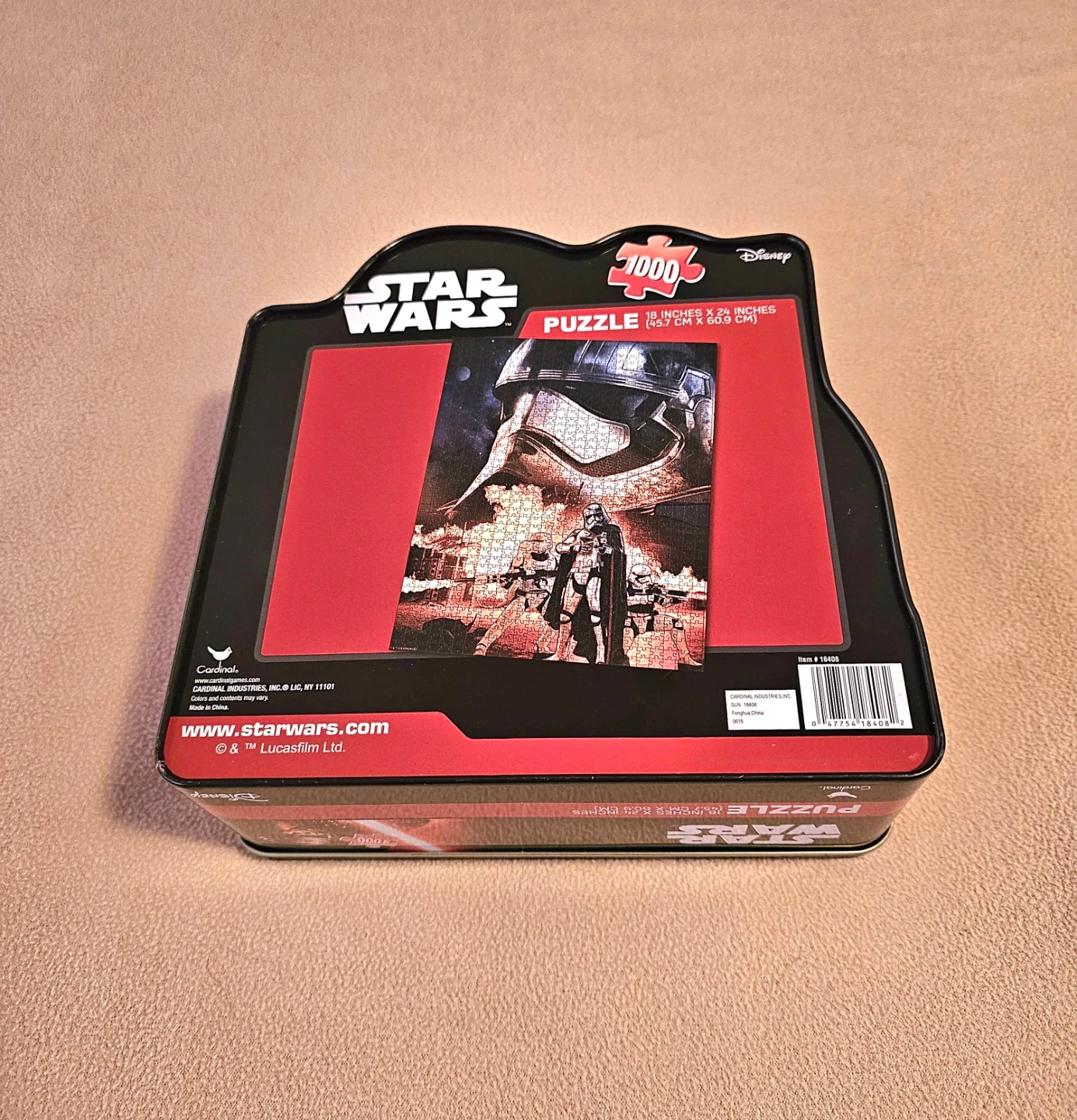 Star Wars: The Force Awakens 1000-piece puzzle by Cardinal featuring Captain Phasma and Stormtroopers. Comes in collectible metal tin. The finished puzzle is 18 inches by 24 inches (45.7 cm x 60.9 cm). Great for Star Wars fans! Only used once, still in great shape! $5